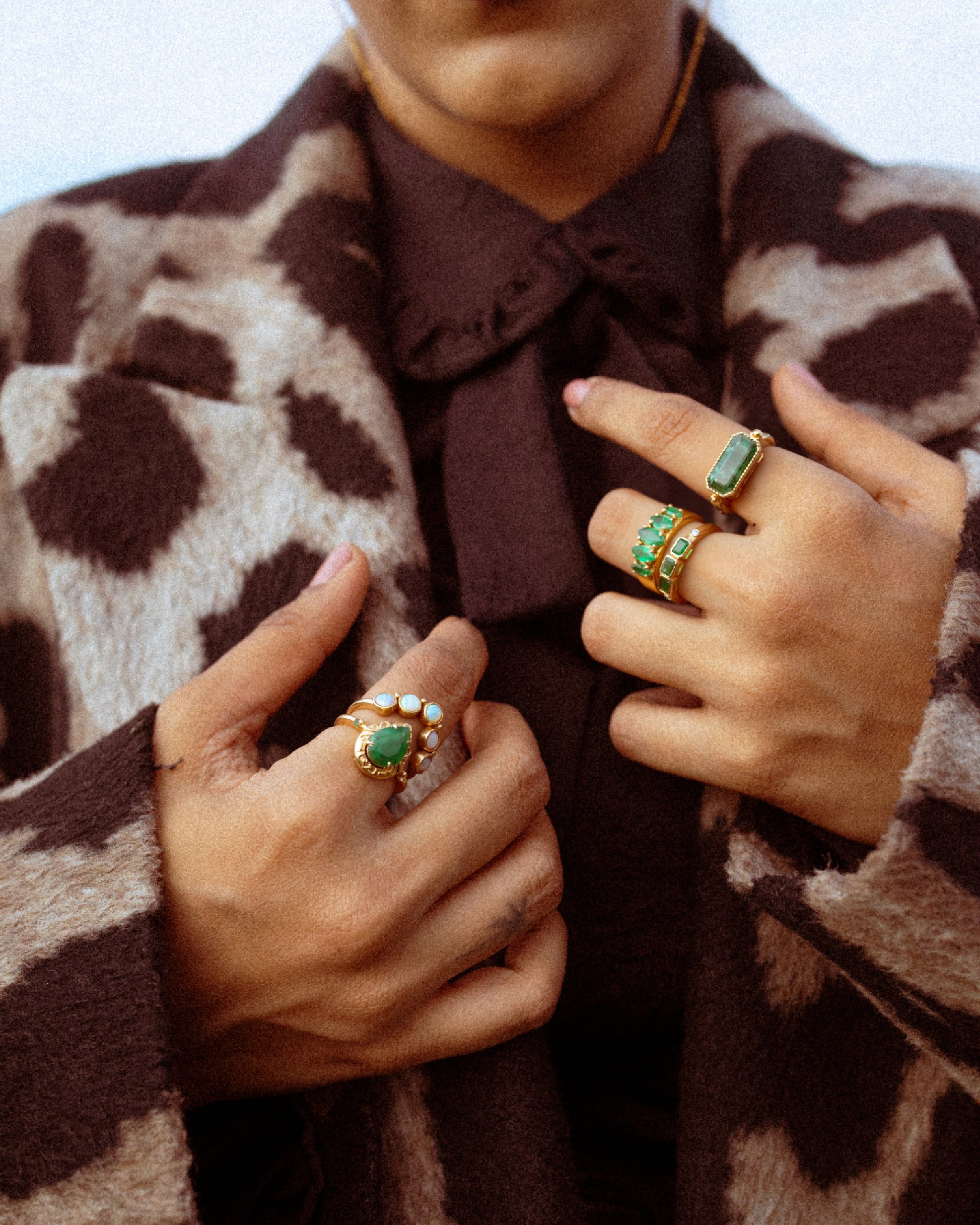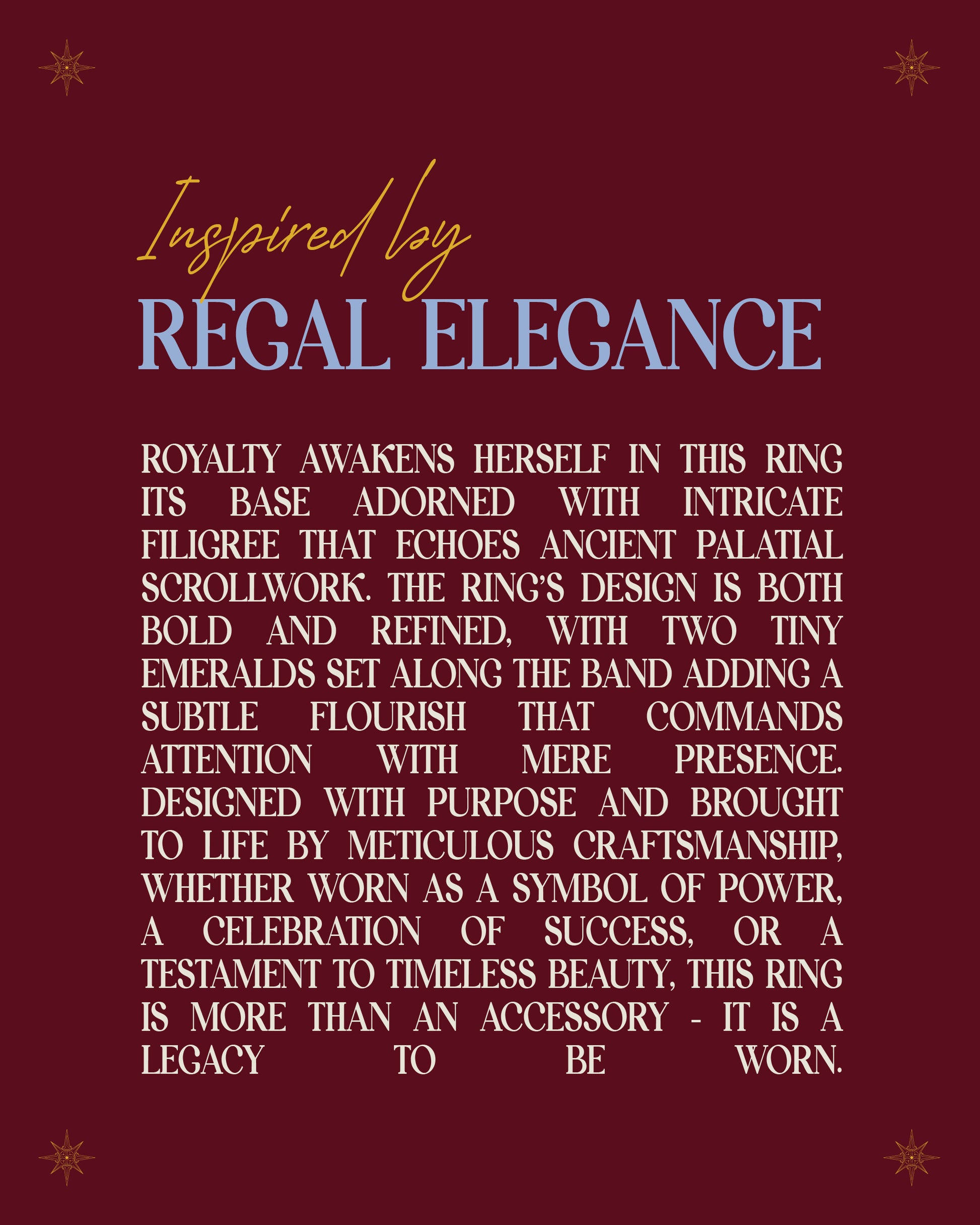 The ring’s design is both bold and refined, with two tiny emeralds set along the band adding a subtle flourish that commands attention with mere presence. Designed with purpose and brought to life by meticulous craftsmanship, whether worn as a symbol of power, a celebration of success, or a testament to timeless beauty, this ring is more than an accessory - it is a legacy to be worn.