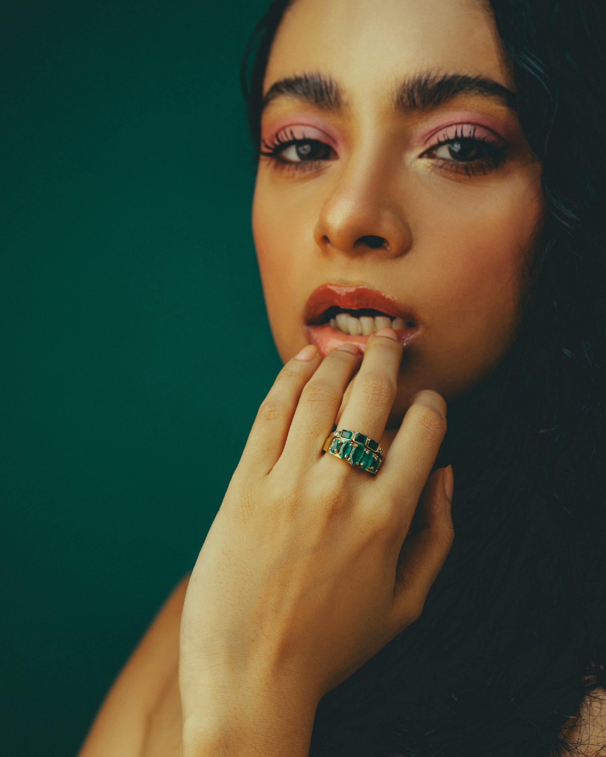 Three rich emeralds - set side by side in gleaming 18k gold - nestle like secret hearts of a tropical rainforest, each one reflecting a promise of harmony as they catch the light with quiet intensity. Tiny diamonds flank the band on either side, their brilliant sparkle echoing dewdrops along the forest floor. The gold itself is hand-carved to evoke the gentle curves of ancient vines entwined in an enchanted garden.