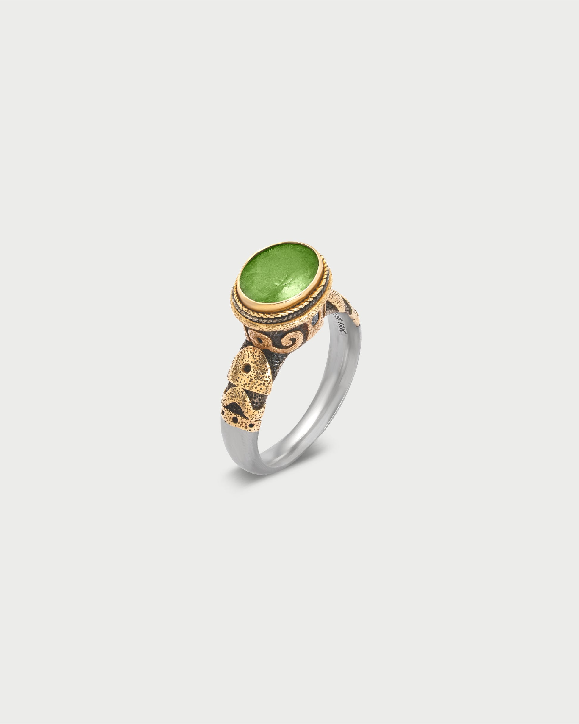 Every facet of this ring evokes a sense of passion and refinement, as though it was crafted beneath starry skies in a Moroccan kasbah. The radiant peridot - known as the “evening emerald” in dusty market stalls - captures both magic and eternity, offering a refreshing glow that speaks of renewal and growth. Let this ring become a cherished heirloom, a symbol of elegance that transcends time and holds within it the hushed secrets of sun-drenched dunes and hidden springs.