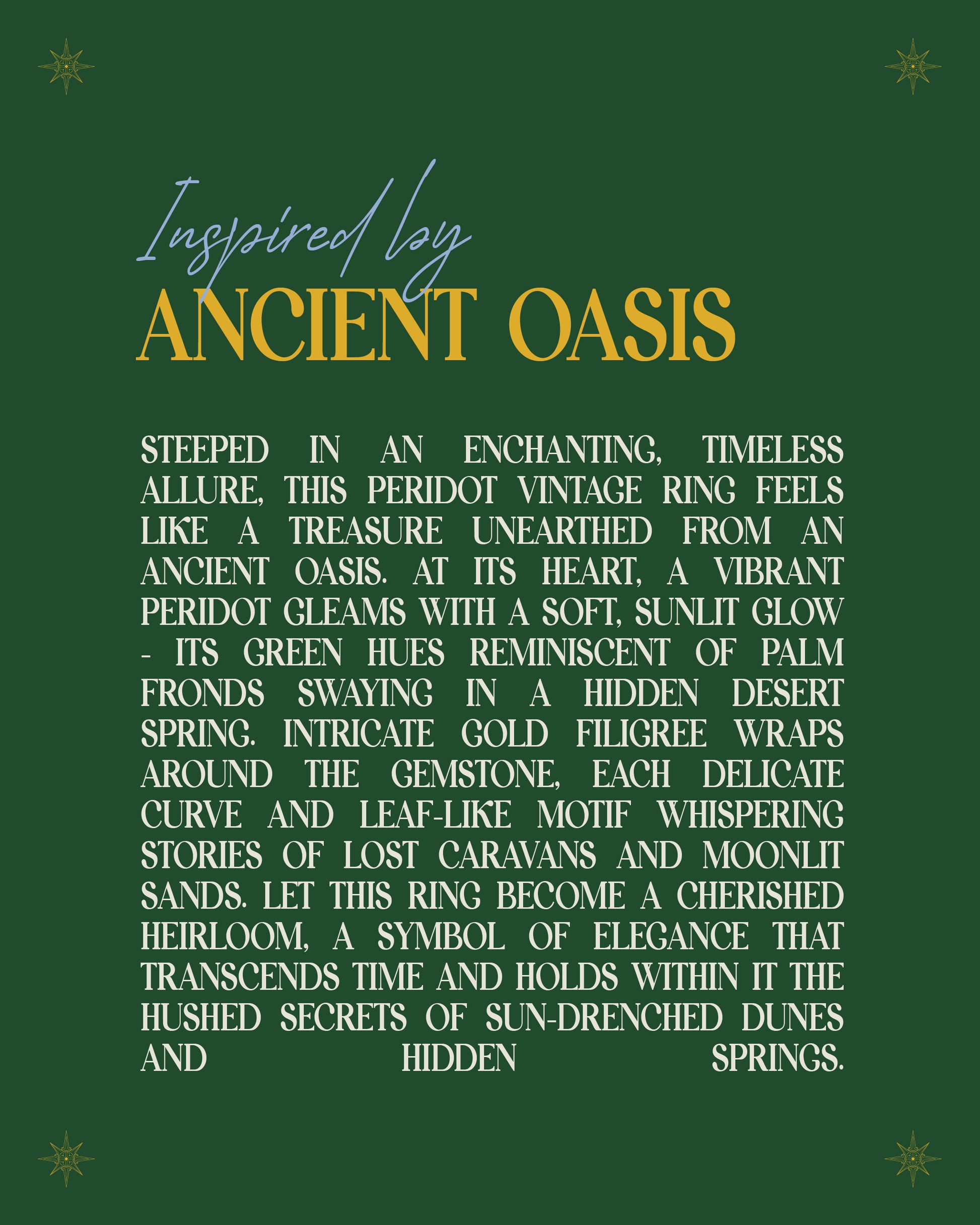 Steeped in an enchanting, timeless allure, this Peridot Vintage Ring feels like a treasure unearthed from an ancient oasis. At its heart, a vibrant peridot gleams with a soft, sunlit glow - its green hues reminiscent of palm fronds swaying in a hidden desert spring. Intricate gold filigree wraps around the gemstone, each delicate curve and leaf-like motif whispering stories of lost caravans and moonlit sands.