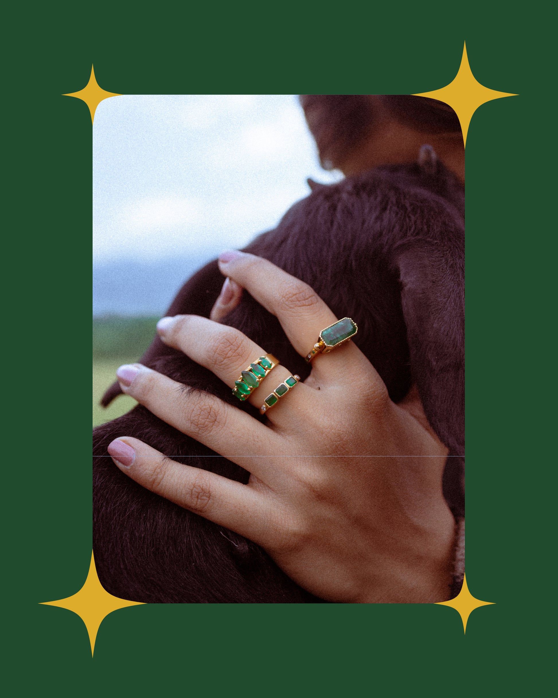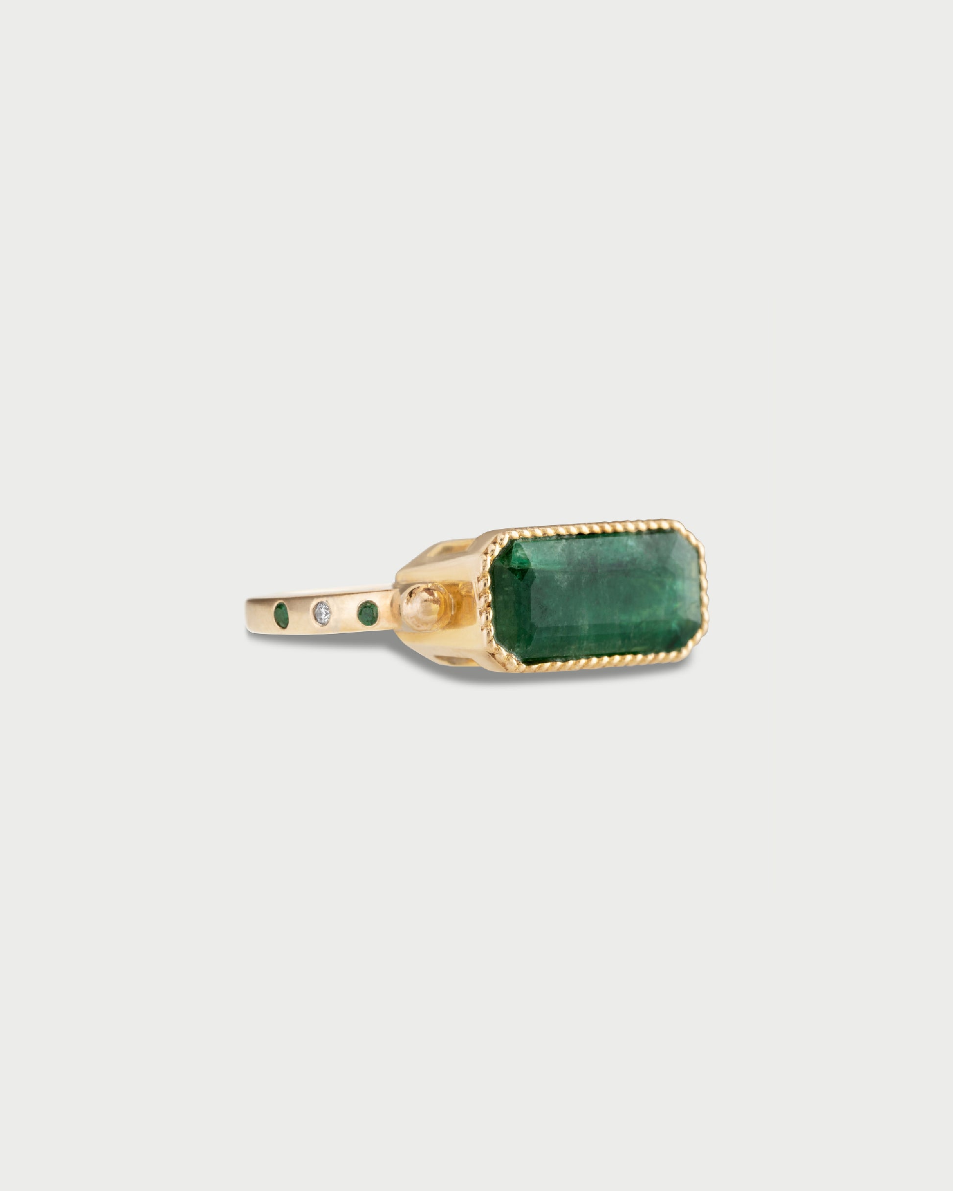 In the candlelit halls of a Jaipur palace, the Legacy Emerald Ring - crafted in 18k gold with a uniquely cut rectangular emerald set in the center - glows like a hidden treasure, its deep green heart framed by gleaming diamonds.