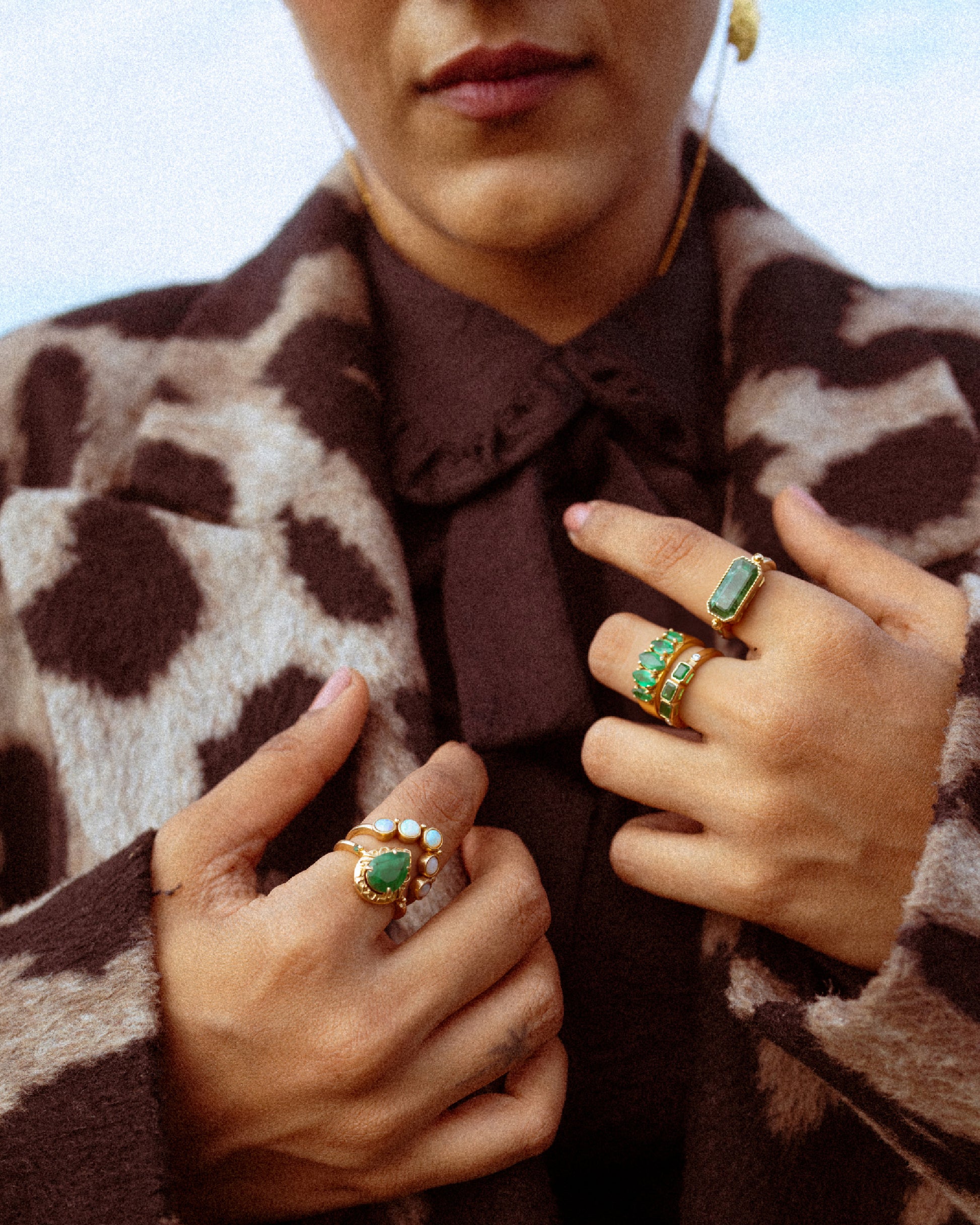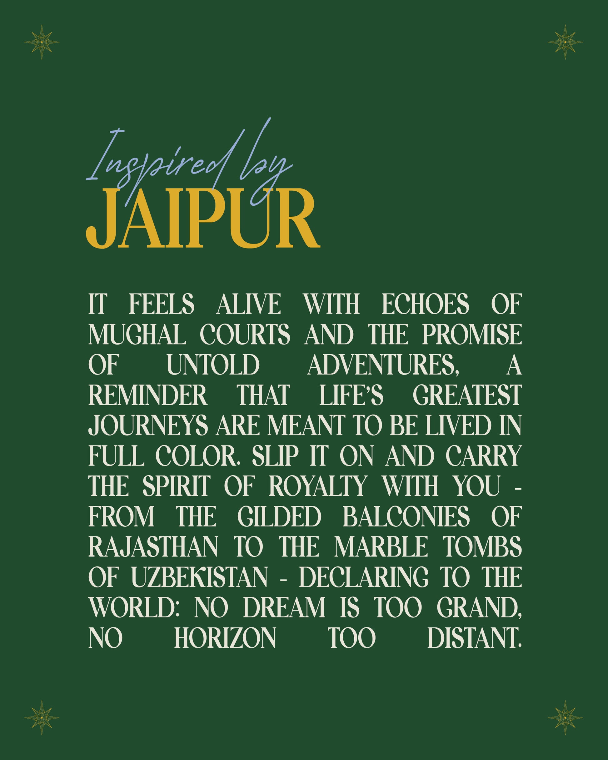 Along the band, smaller emeralds and diamonds catch every flicker of light, adding delicate whispers of color and fire. It feels alive with echoes of Mughal courts and the promise of untold adventures, a reminder that life’s greatest journeys are meant to be lived in full color. Slip it on and carry the spirit of royalty with you - from the gilded balconies of Rajasthan to the marble tombs of Uzbekistan - declaring to the world: no dream is too grand, no horizon too distant.