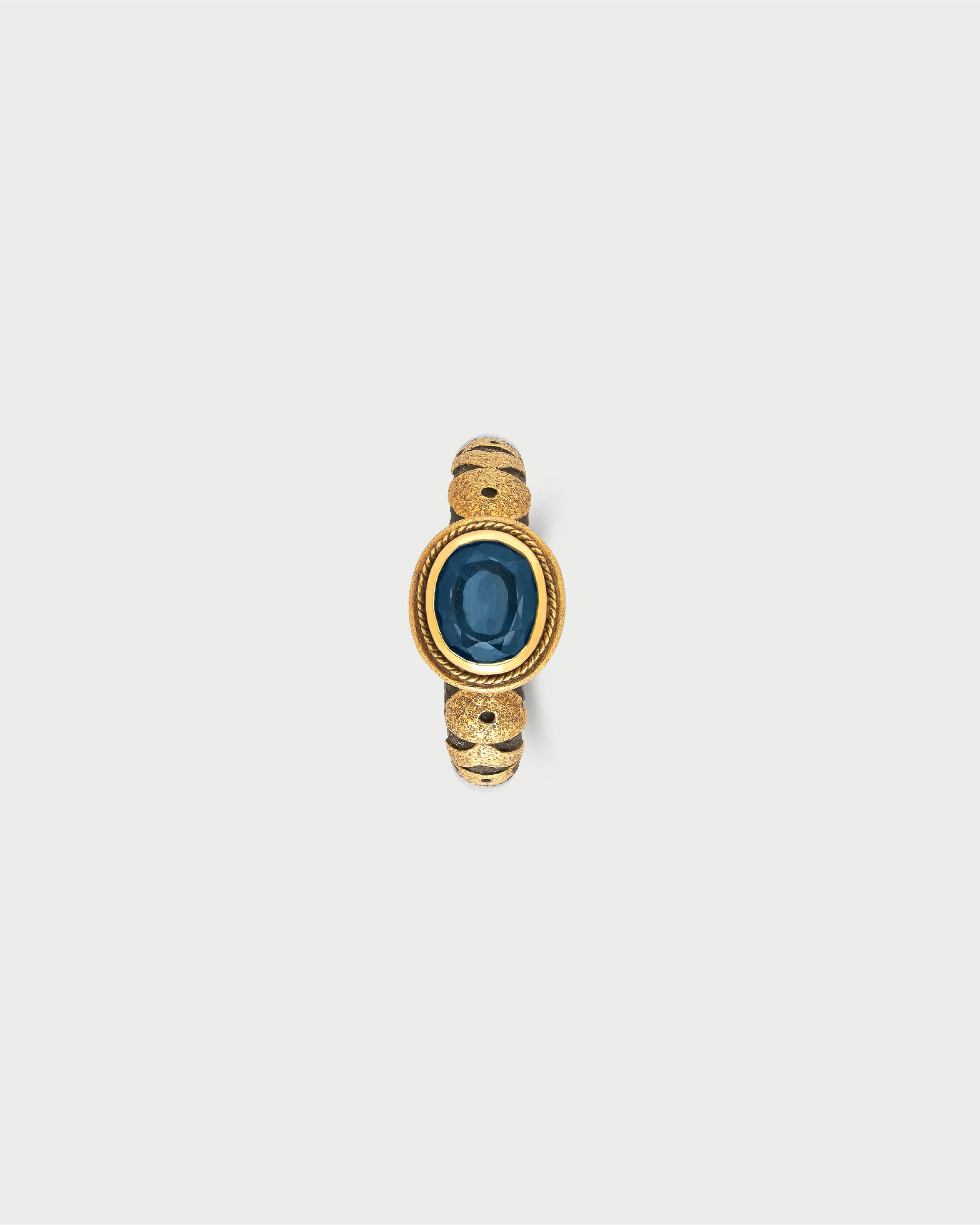 Under the hush of a Sultan’s dawn on Bahrain’s azure shores, this ring feels like a secret tide whispering against white sand mosques. At its heart lies a shimmering blue topaz - its facets catching light like sunlight skimming over gentle waves in the Arabian Gulf. The band, forged from 925 silver and gilded in warm gold filigree, bears patterns reminiscent of ancient dhow sails billowing across tranquil seas. Tiny diamonds, like scattered stars, glint at its shoulders - echoes of moonlight dancing on midnight tides.