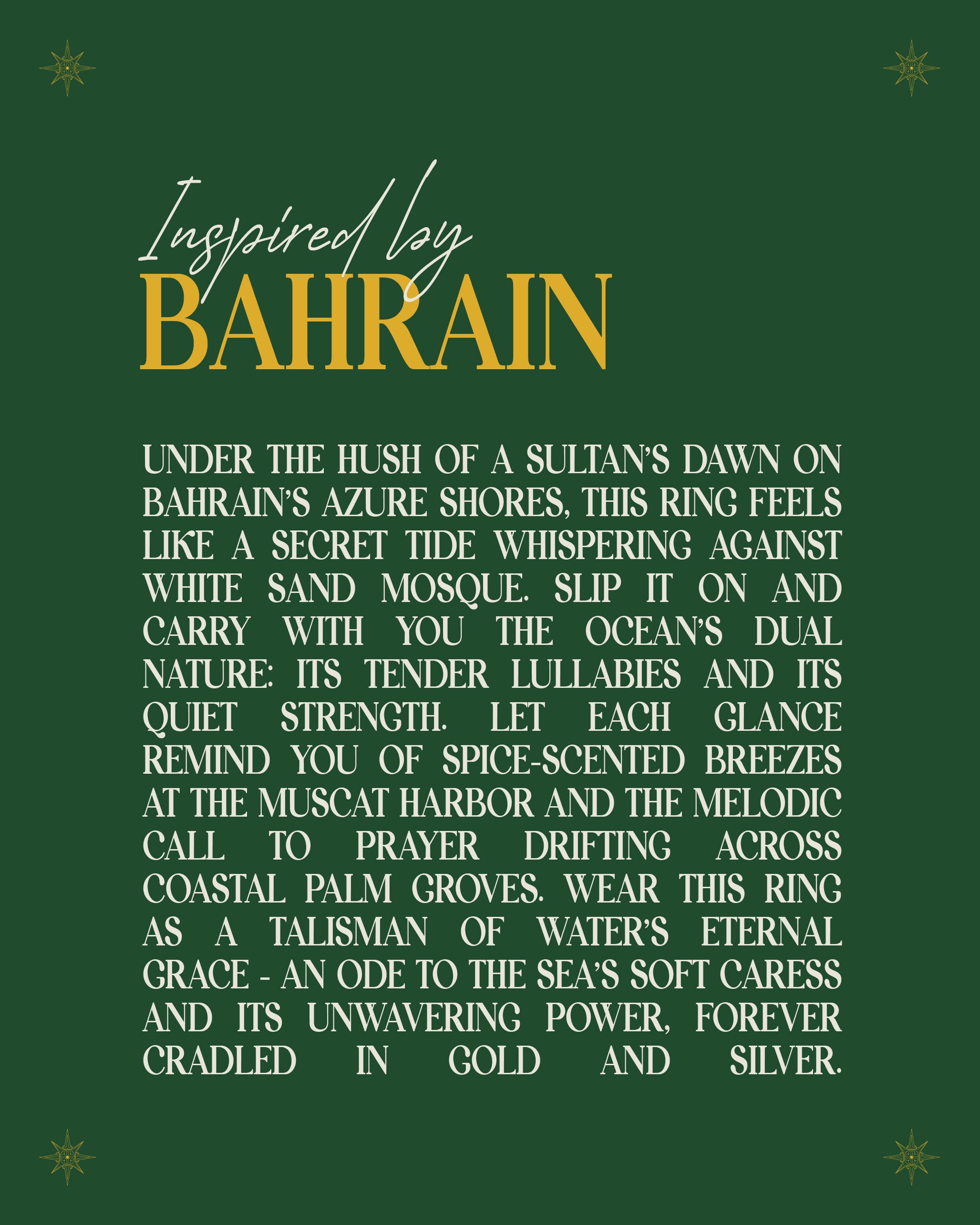 Slip it on and carry with you the ocean’s dual nature: its tender lullabies and its quiet strength. Let each glance remind you of spice-scented breezes at the Muscat harbour and the melodic call to prayer drifting across coastal palm groves. Wear this ring as a talisman of water’s eternal grace - an ode to the sea’s soft caress and its unwavering power, forever cradled in gold and silver.