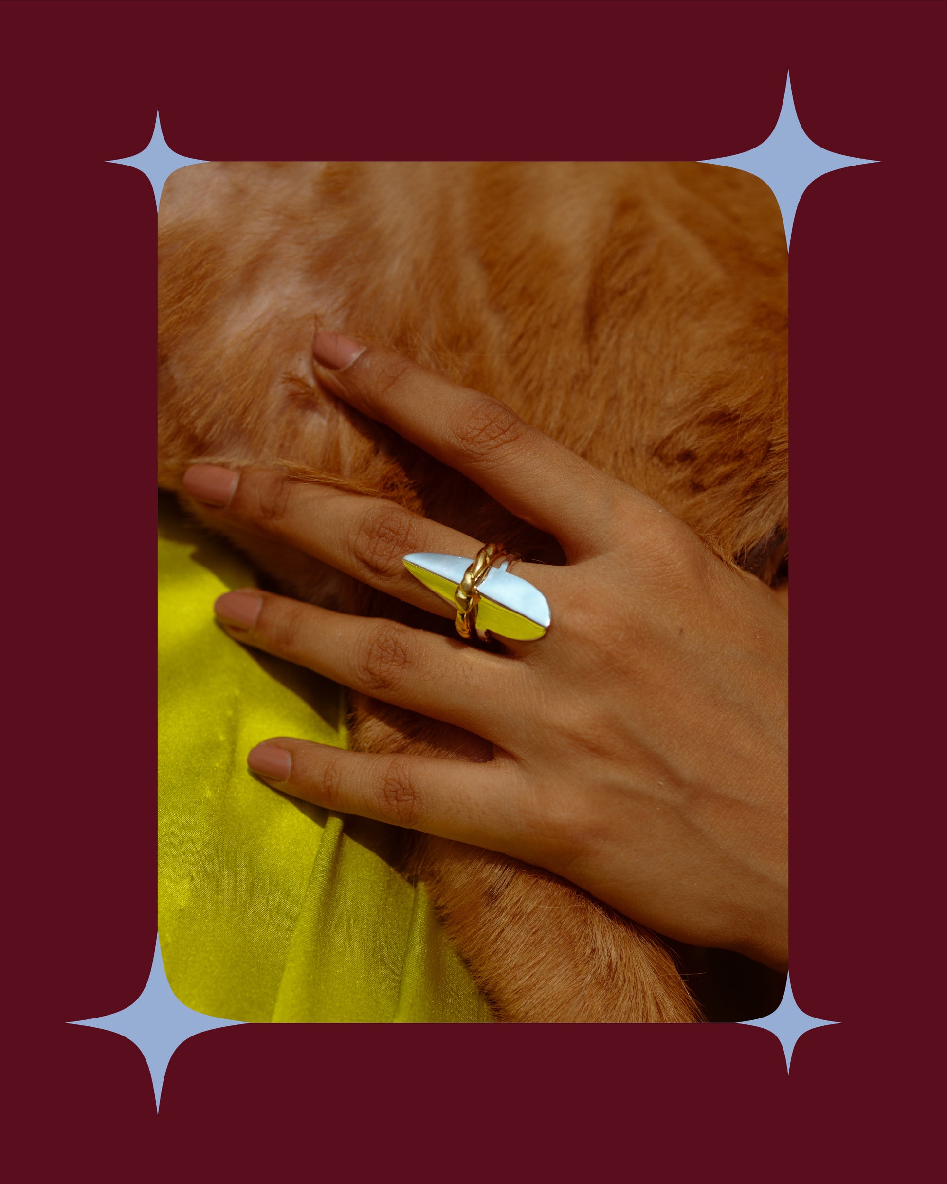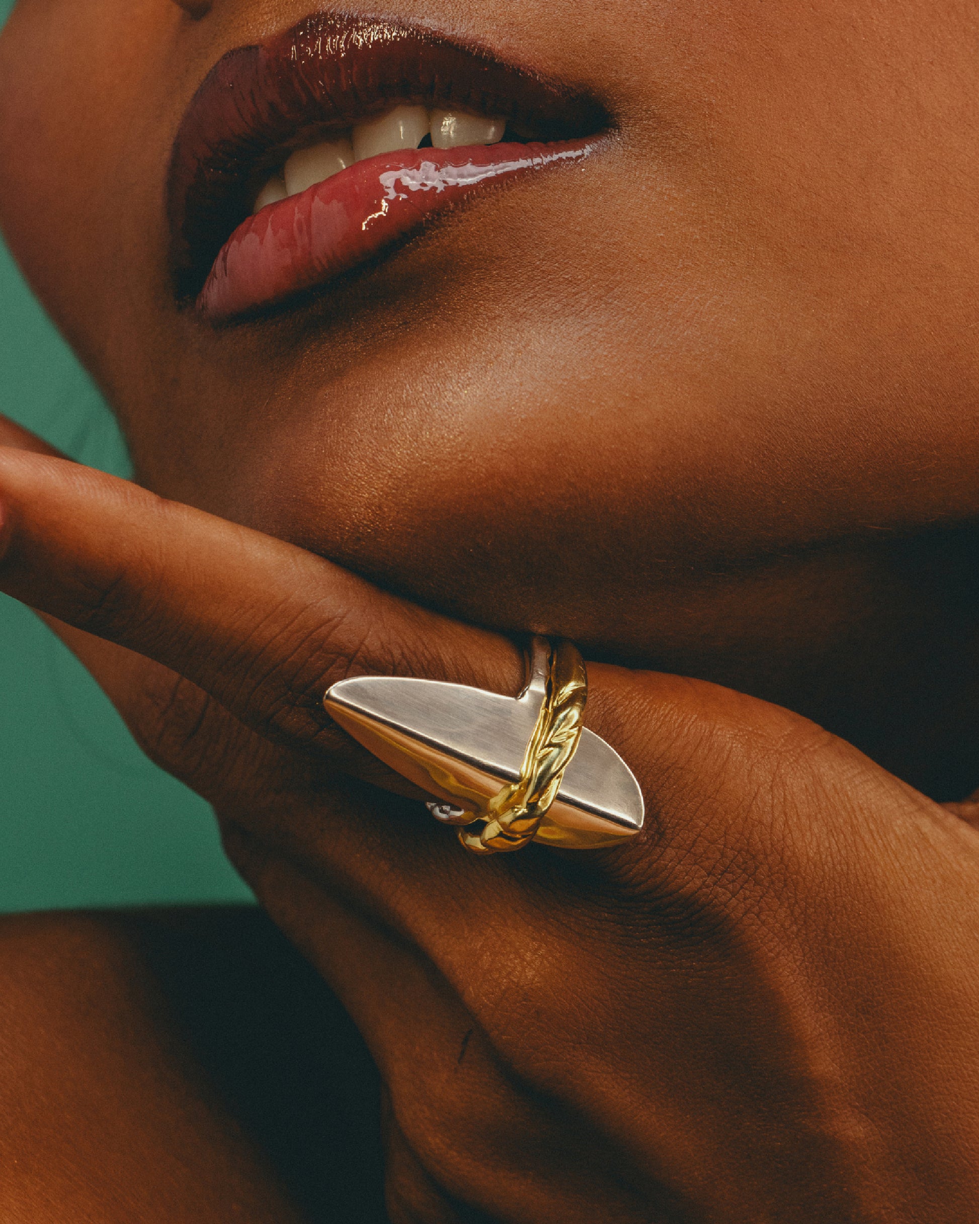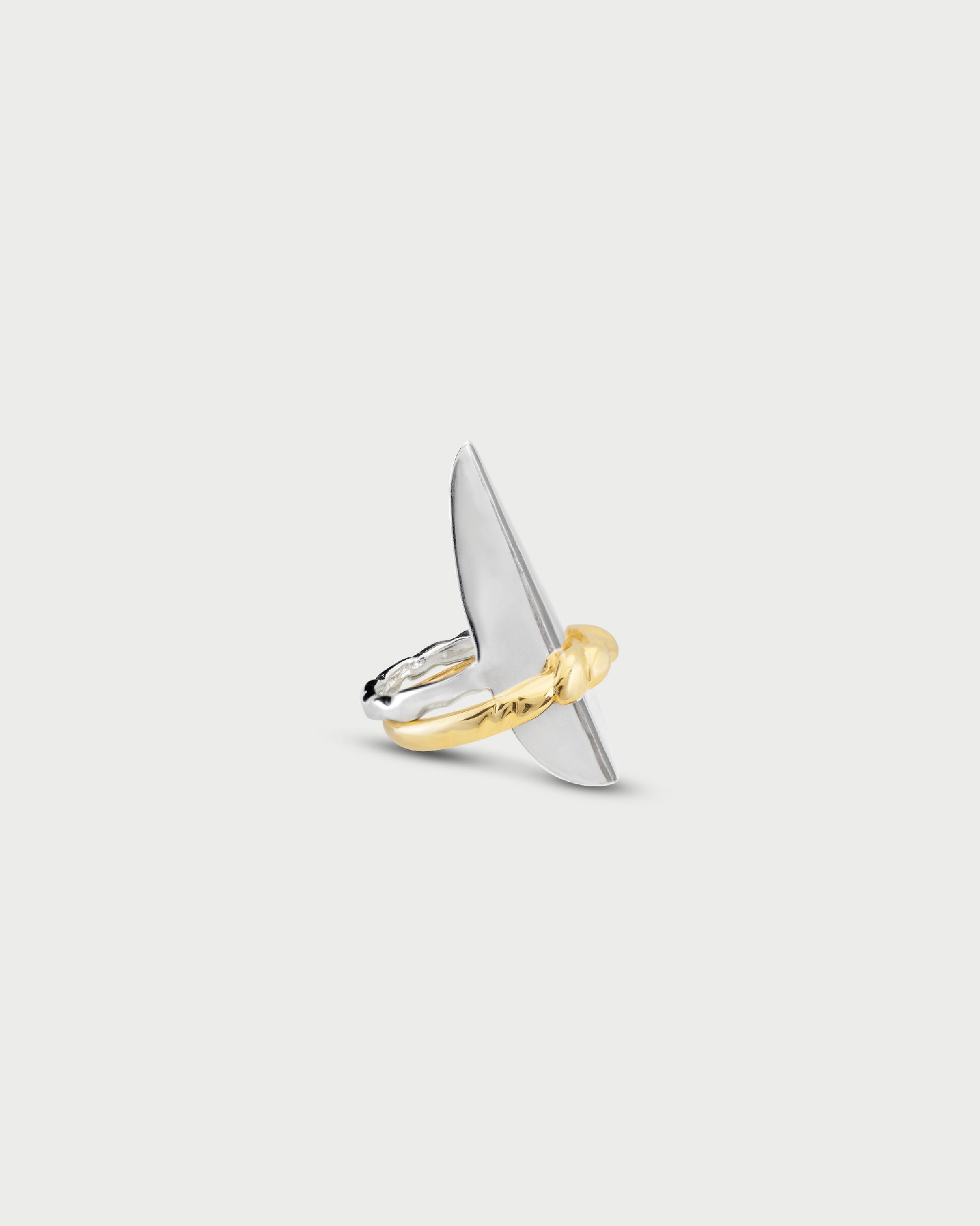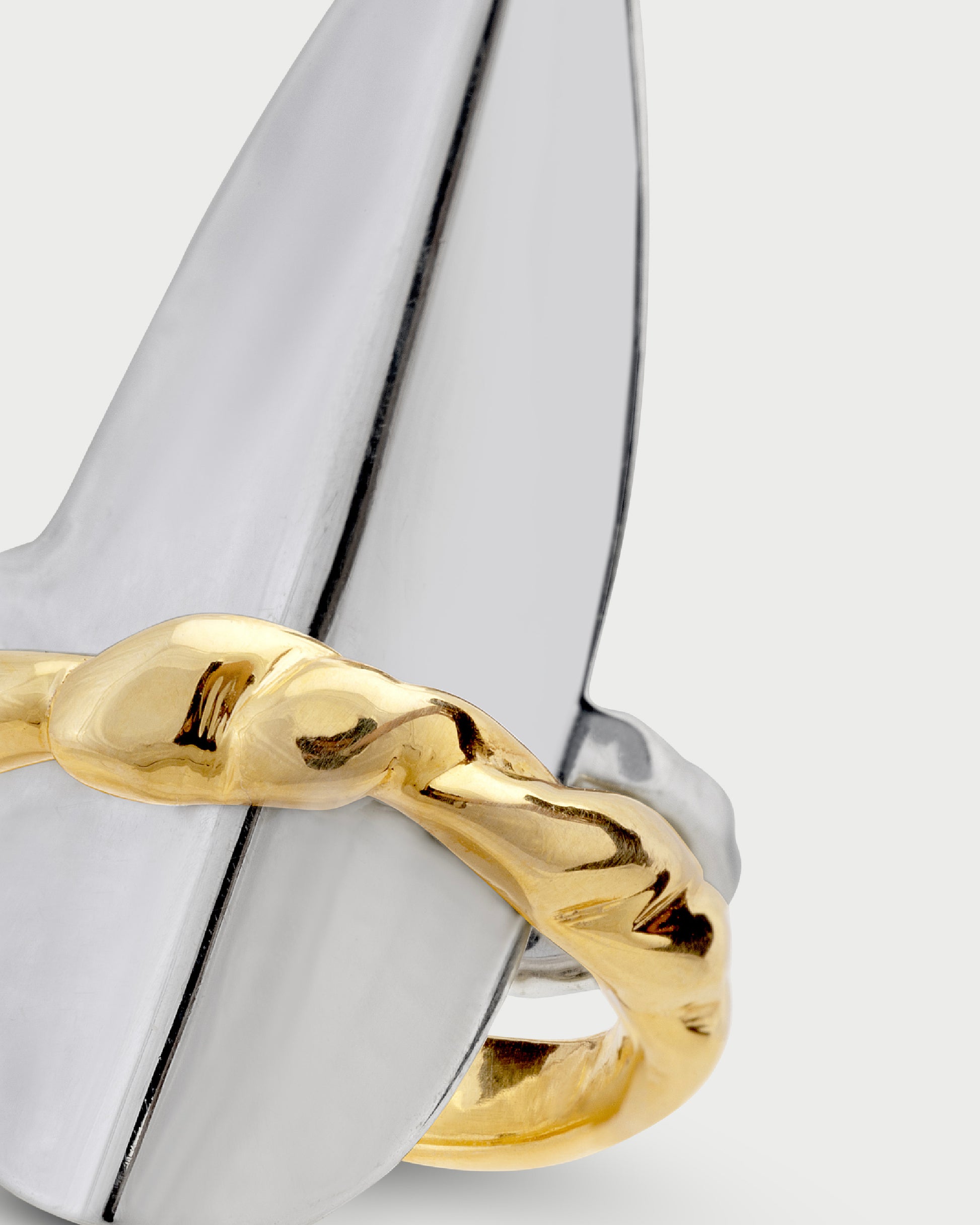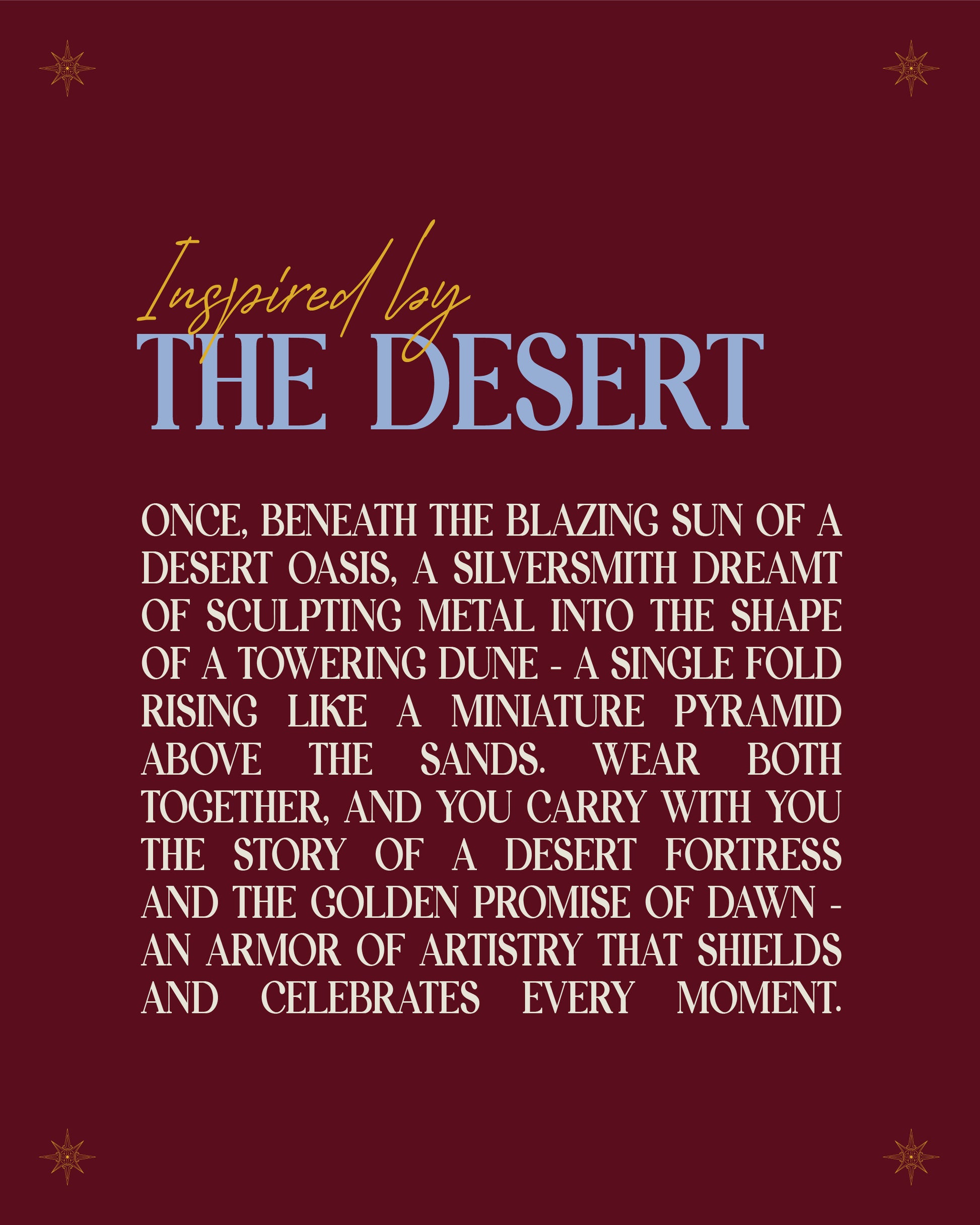 To complete this tale of contrasts, a slender gold-plated band with a soft, knotted curve slips over the silver form, wrapping it in warmth and opulence. Wear both together, and you carry with you the story of a desert fortress and the golden promise of dawn - an armor of artistry that shields and celebrates every moment.