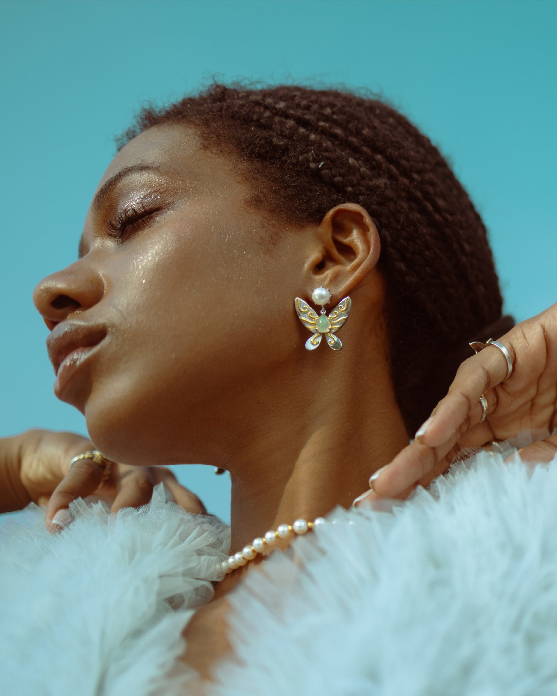 Slip on these earrings alongside the Metamorphosis Ring, and you carry both the hush of new light and the promise of metamorphosis in every flutter - your own talisman for growth, a keepsake of journeys yet to unfold.