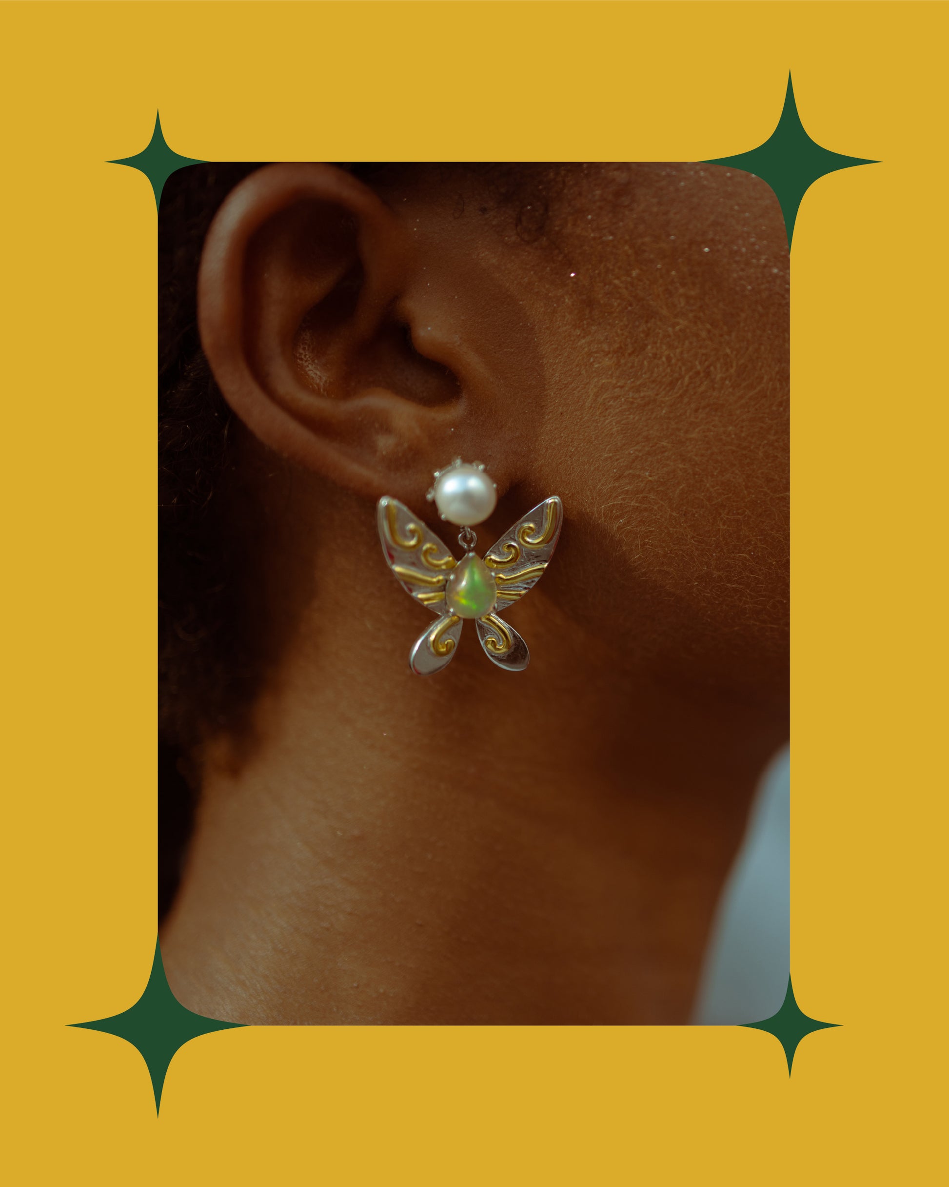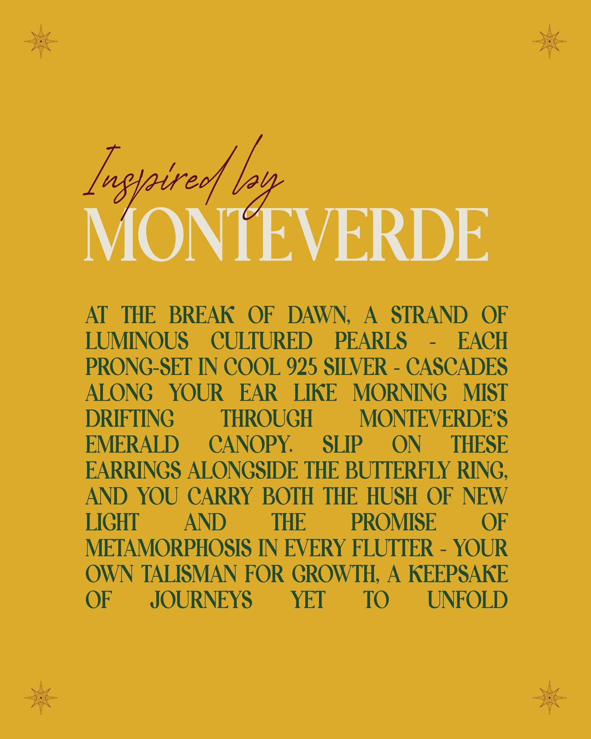 At the break of dawn, a strand of luminous cultured pearls, each prong-set in cool 925 silver - cascades along your ear like morning mist drifting through Monteverde’s emerald canopy. Midway, a pear-shaped opal glows with spectral fire, cradled in delicate silver claws, echoing the opal at the heart of our Metamorphosis Earrings, whose 925-silver wings kissed with 18k gold filigree shimmer like first light on tropical dew. Beneath that rainbow soul, a butterfly unfurls - its wings of gold-plated filigree so fine they seem spun from sunbeams.