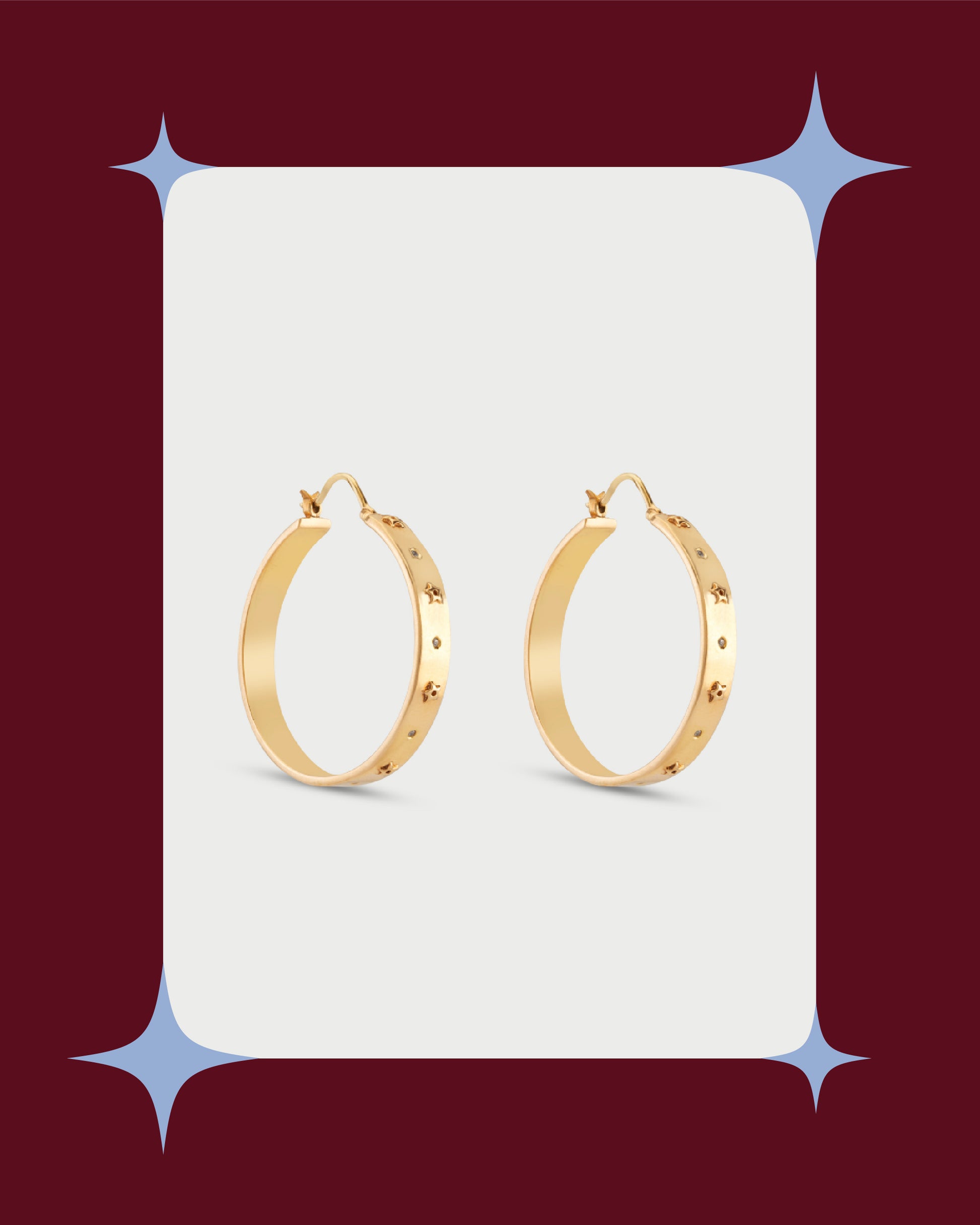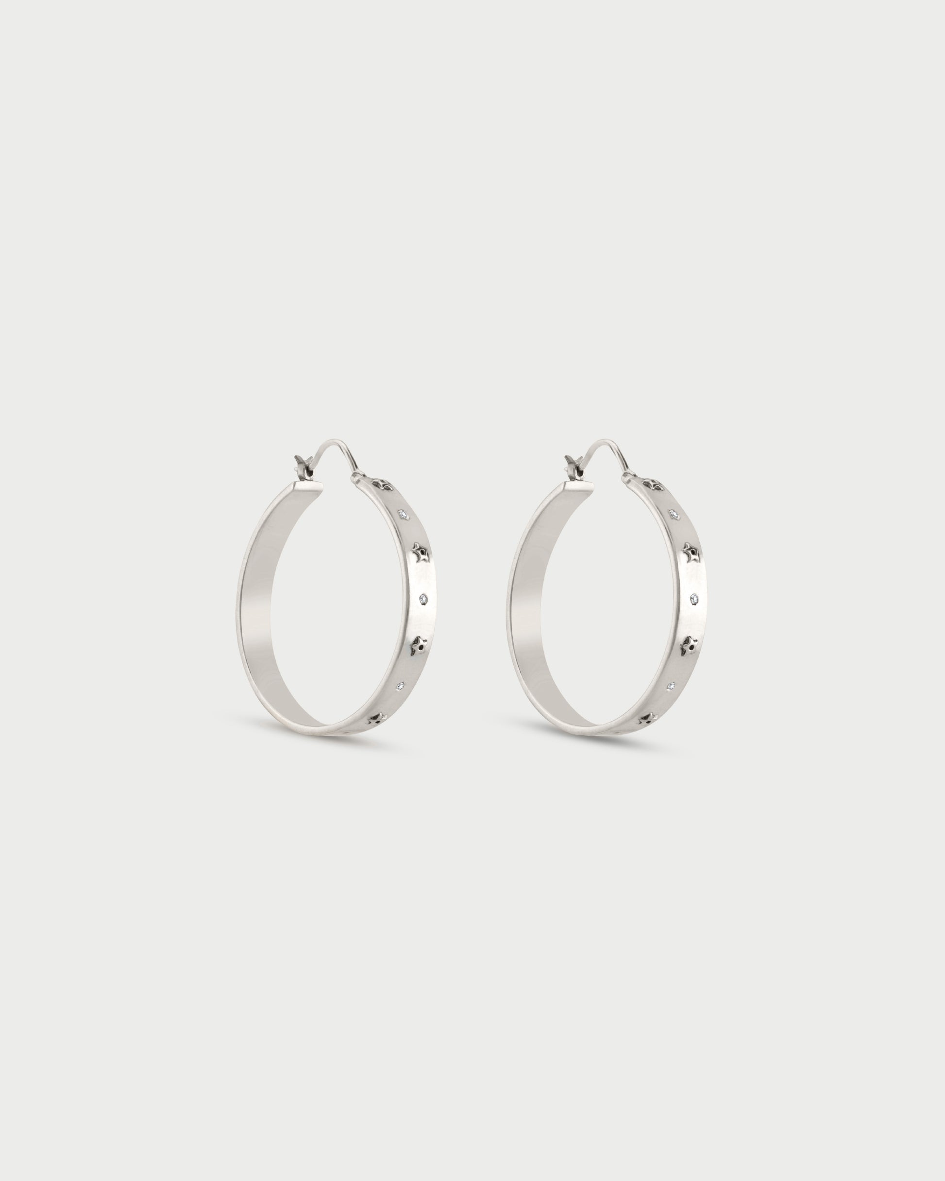 In the hush before a midnight voyage, a pair of flattened 18k gold hoops was born - its broad curves etched with tiny embossed stars, each one cradling a single diamond that twinkles like distant beacons guiding restless hearts. Worn against the skin, they feel less like adornment and more like talismans of the night sky, their alternating constellations and gem-lit points echoing the infinite loop of celestial bodies that have steered wanderers across oceans and mountains.