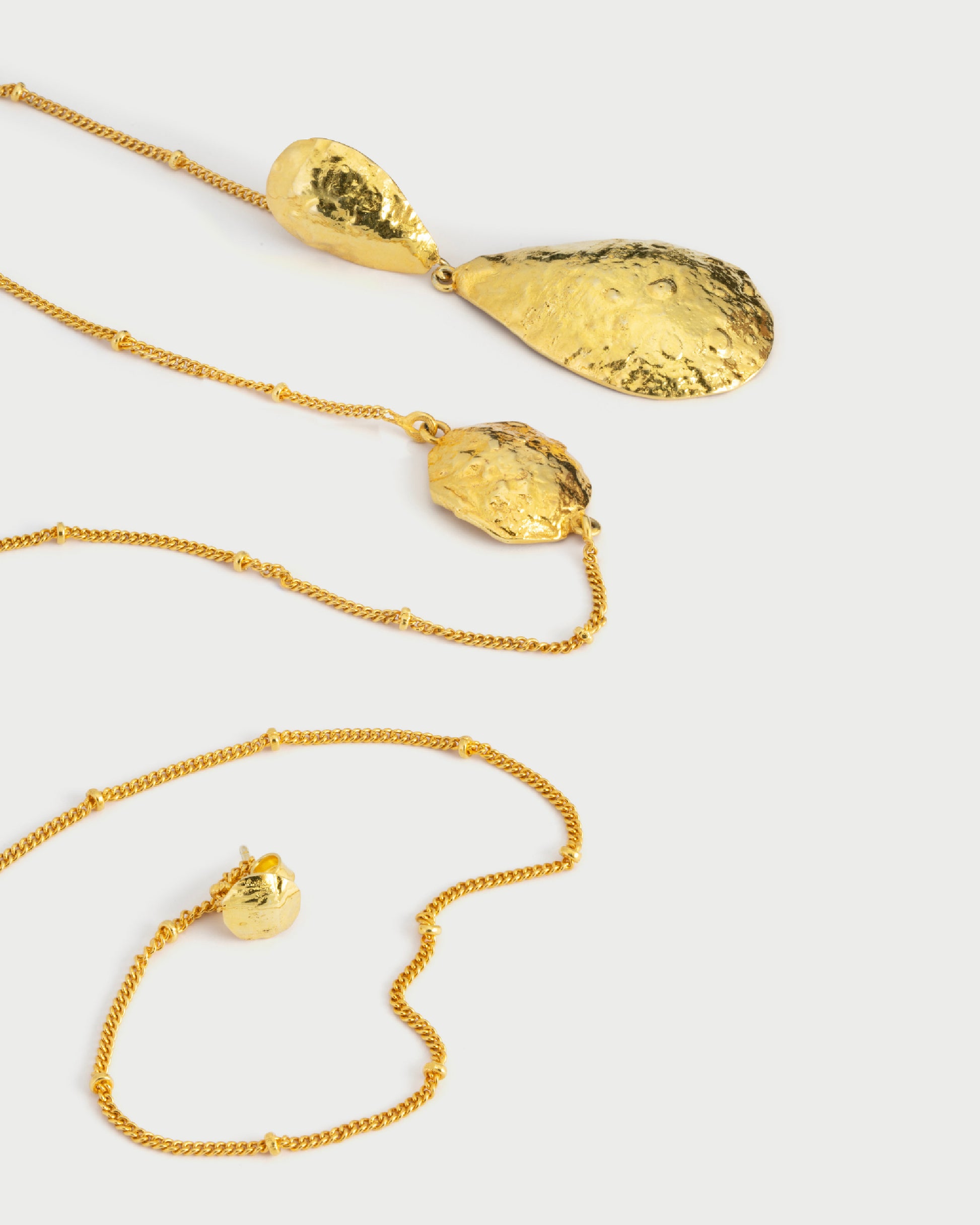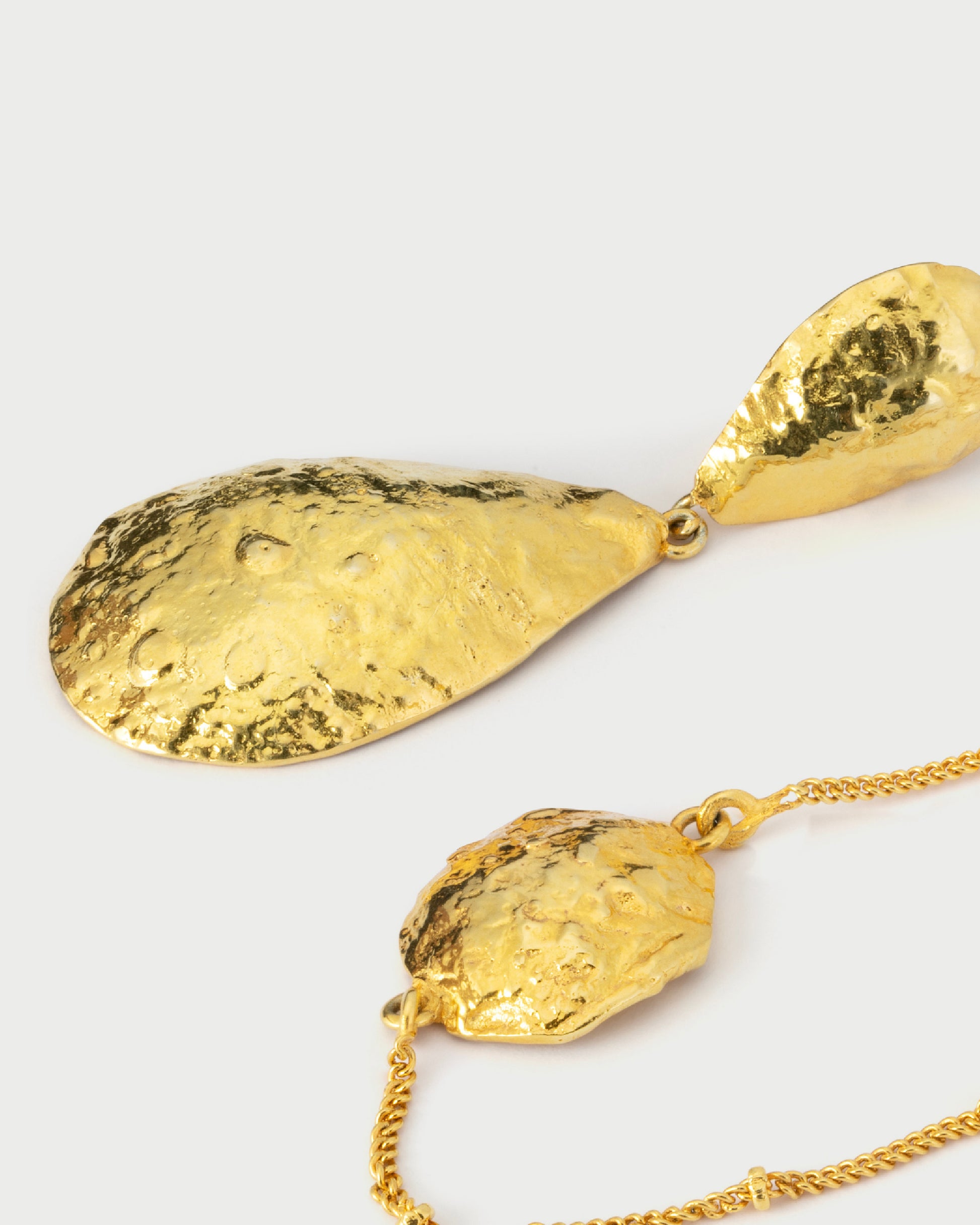 In the first light filtering through Kashmiri chinar groves, a silversmith recalls the soft toll of temple bells and the hush of ancient chants. From 925 silver, each earring is spun into a sculptural ode - its hammered gold-plated (2.5 μm vermeil) surface echoing the undulating ridges of snow-dusted mountains. One stud settles at the lobe like a silent prayer, the other unfurls into a slender chain, punctuated by two pocked orbs that dance with every movement - mirroring the ritual oil lamps that drift through dusk-lit courtyards.