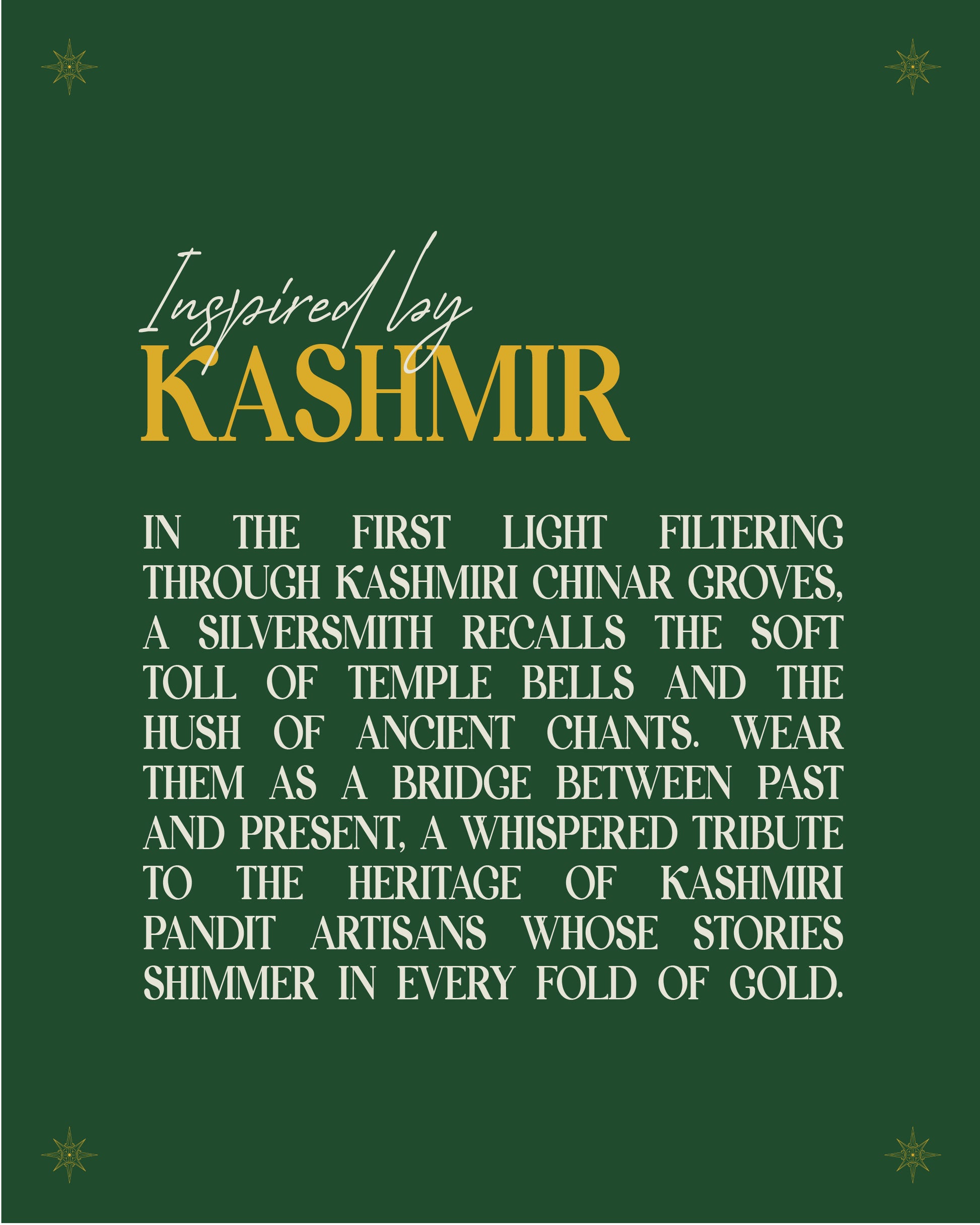 Wear them as a bridge between past and present, a whispered tribute to the heritage of Kashmiri Pandit artisans whose stories shimmer in every fold of gold.