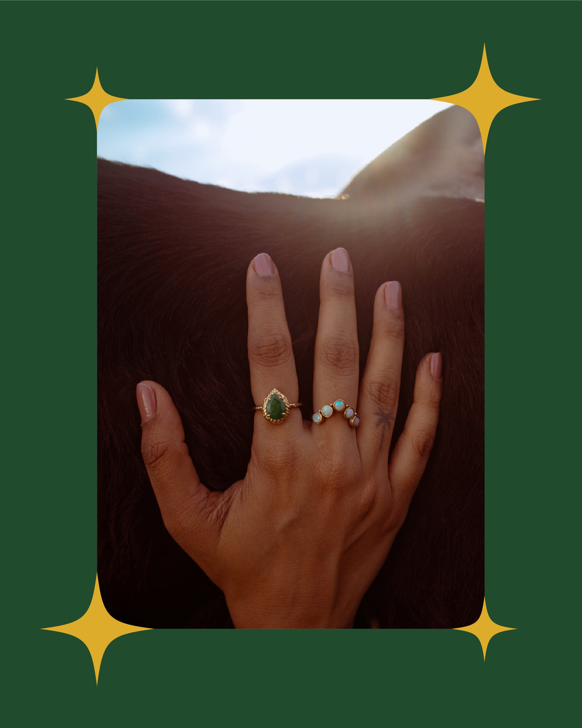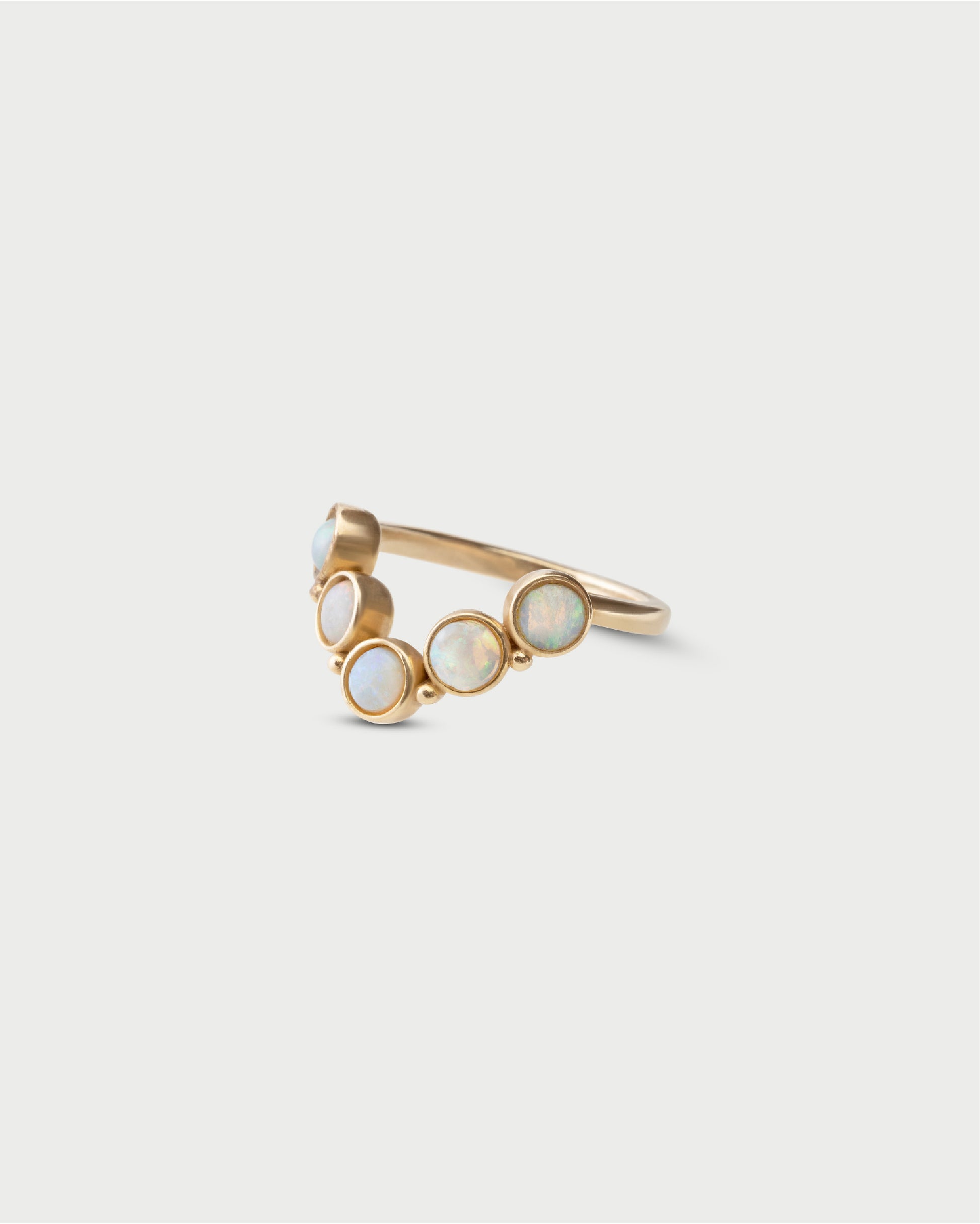 Soft morning light on Australia’s arid plains reveals the opal’s secret brilliance, a kaleidoscope of colour hidden beneath sunbaked earth. This ring - crafted in 18k gold with five opals set in delicate bezels - brings that magic to life: each glowing opal is a tiny world of fire and pastel dreams, nestled along a slender band that feels like holding sunrise itself.