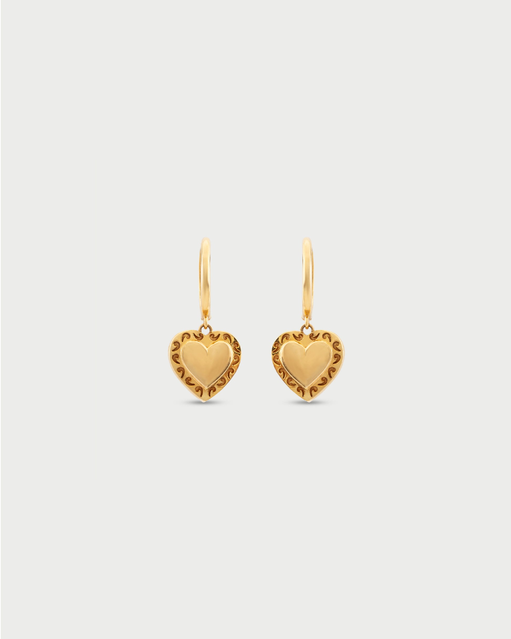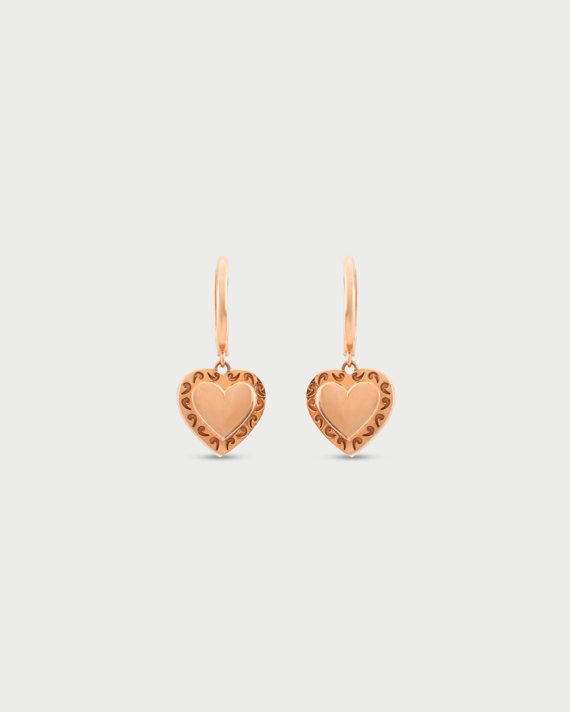 In the golden hush of a midnight atelier, a master artisan coaxed slender 18k gold wire into the shape of a heart - each curve spun like a whispered love note - and suspended it from a delicate hoop, so it floats like a promise at your lobes. Along the heart’s openwork border, filigree swirls breathe like lace, each looping thread a testament to the delicate dance between chaos and control. Every twist and turn in the gold is both crafted and carved away, revealing how true artistry lives as much in absence as in presence.