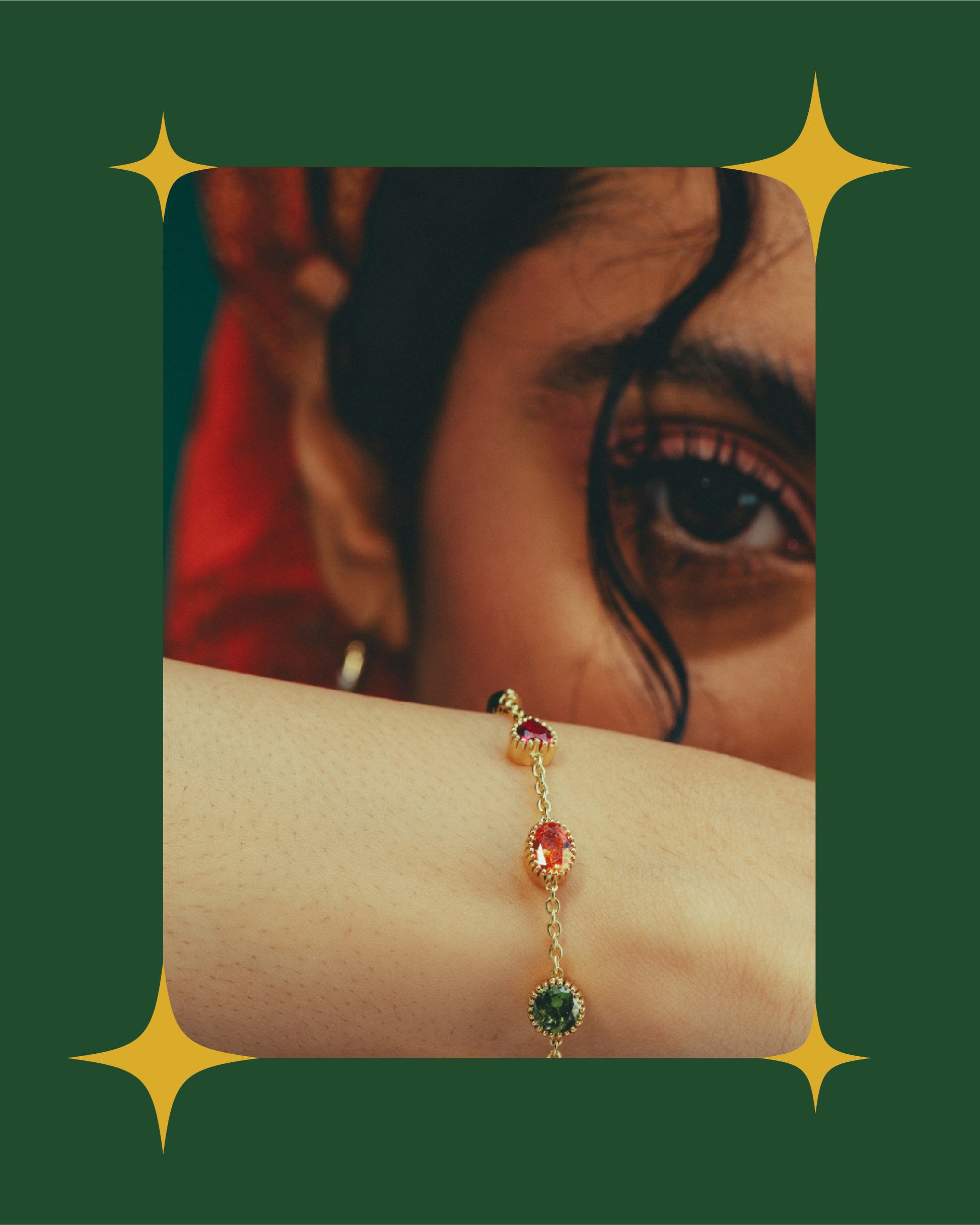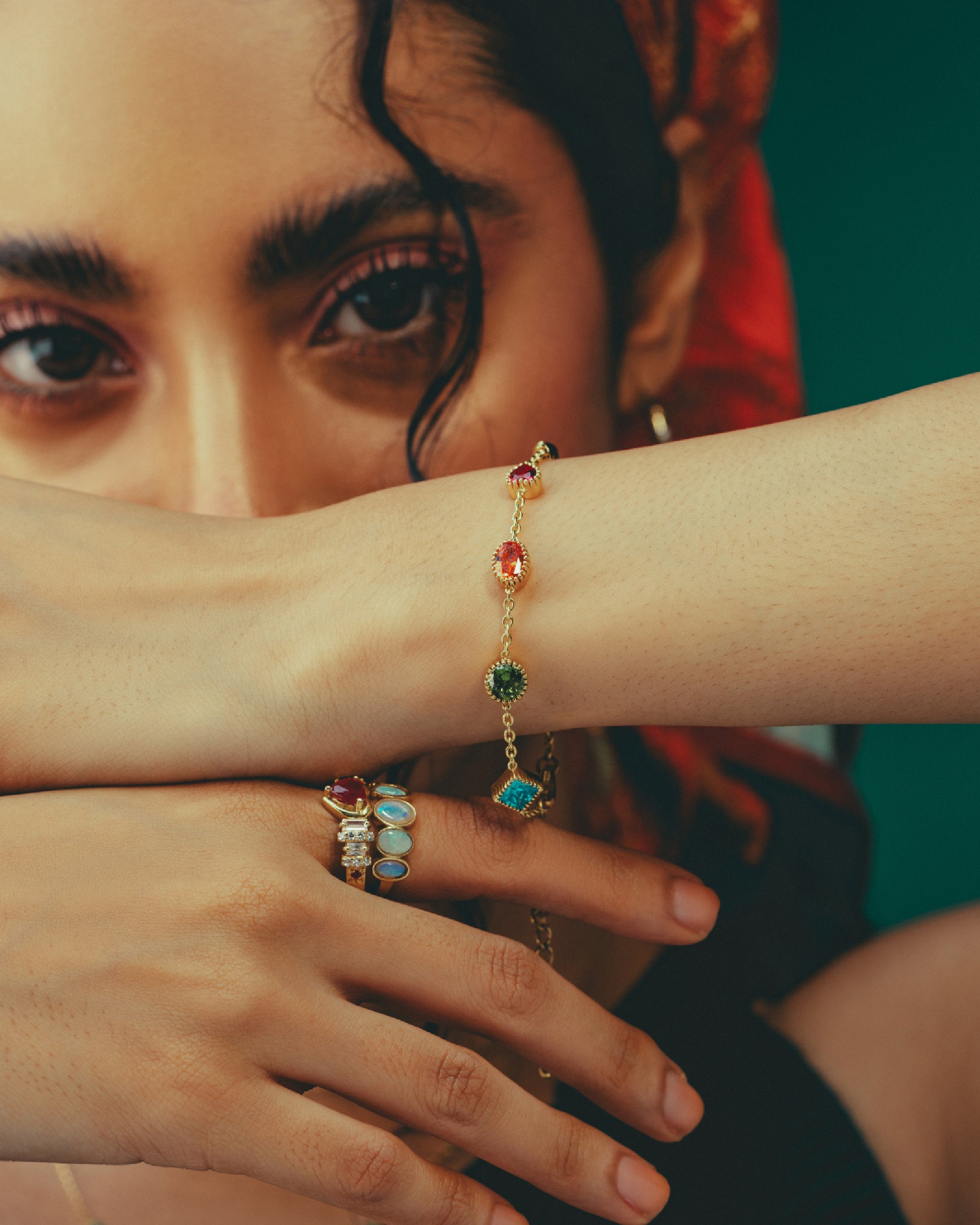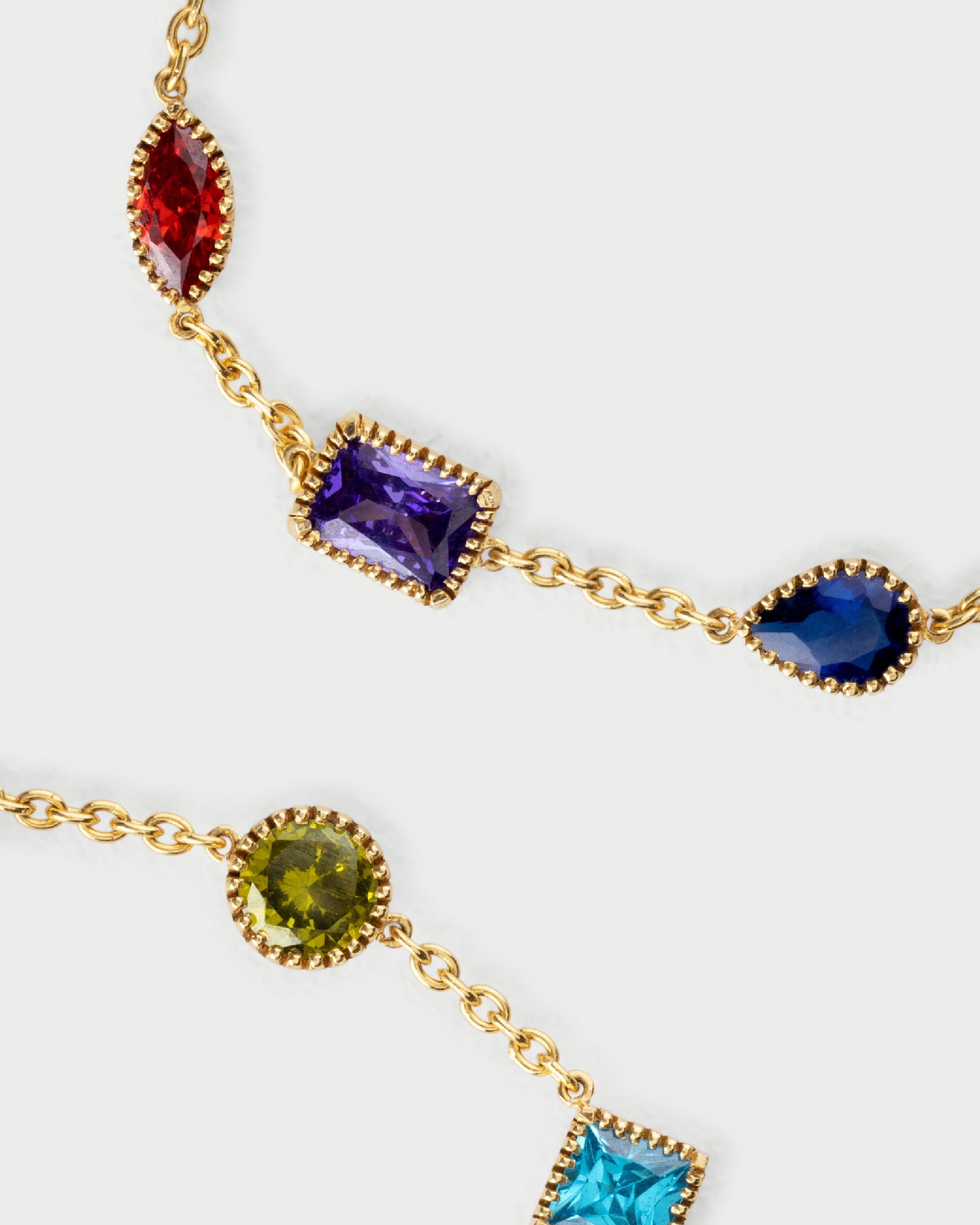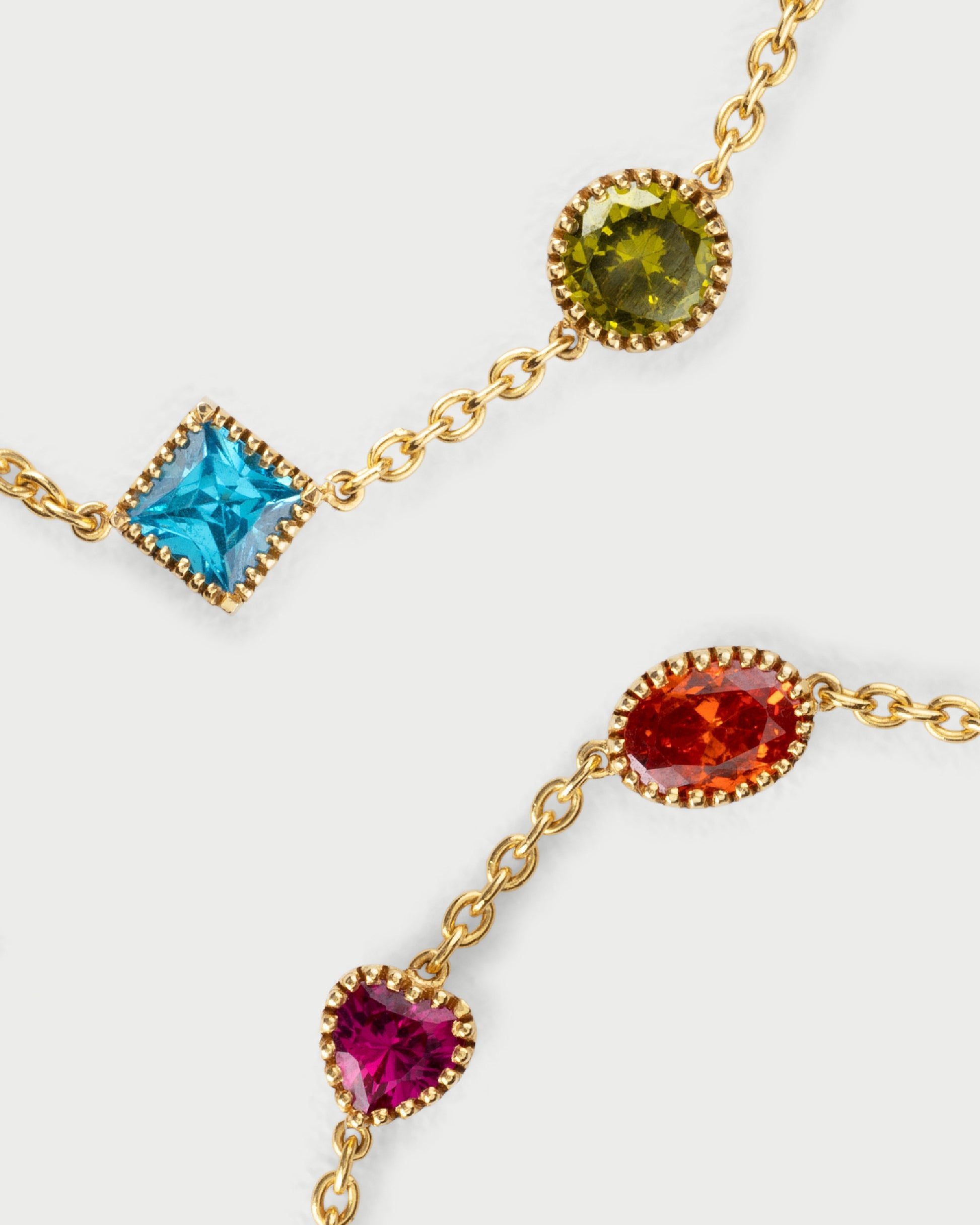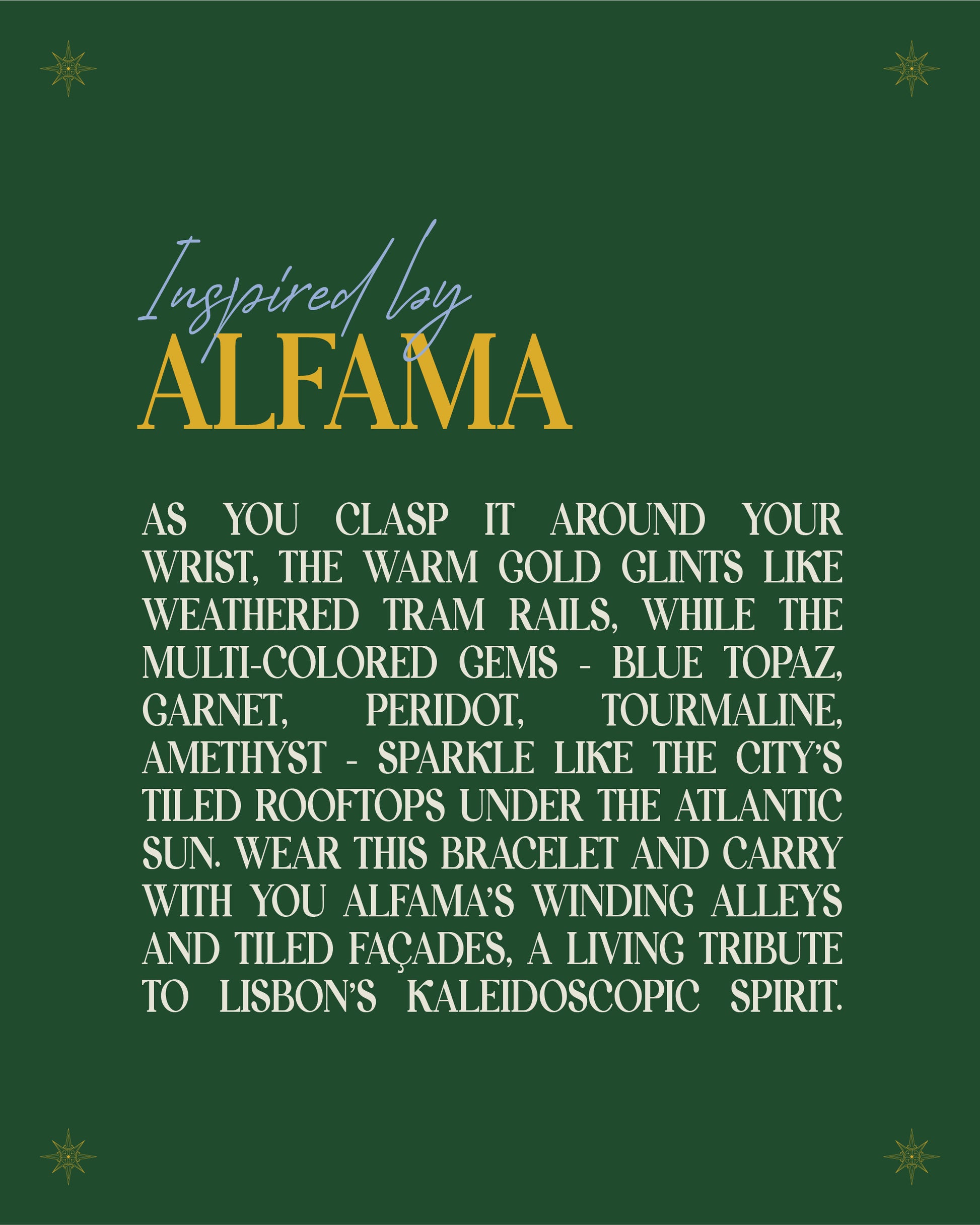 On a sunlit morning in Lisbon’s labyrinthine Alfama district, an artisan paused at a street-side stall, captivated by the riot of colored tiles mosaicing the ancient walls. Back in the workshop, he recreated that living mosaic in precious metal: threading a slender 18k gold chain with bezel-set tourmalines in every shape - heart, oval, marquise, emerald-cut, teardrop, and princess - each stone a vibrant fragment of Portugal’s soul. As you clasp it around your wrist, the warm gold glints like weathered tram rails, while the multi-colored gems - Blue topaz, Garnet, Peridot, Tourmaline, amethyst - sparkle like the city’s tiled rooftops under the Atlantic sun. Wear this bracelet and carry with you Alfama’s winding alleys and tiled façades, a living tribute to Lisbon’s kaleidoscopic spirit.