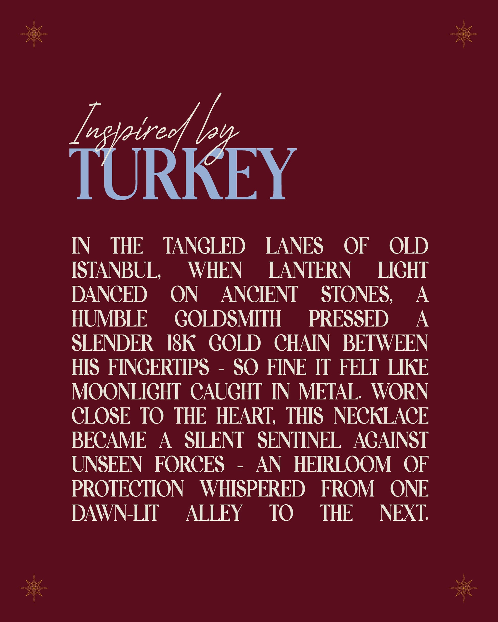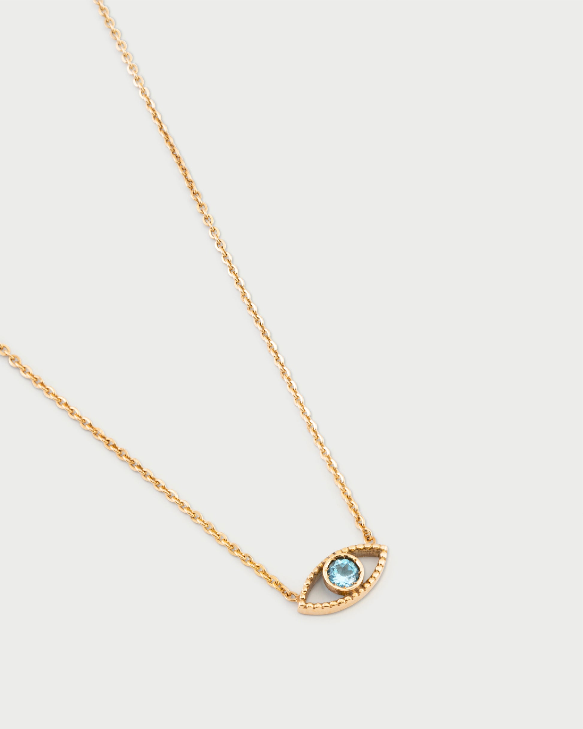 In the tangled lanes of old Istanbul, when lantern light danced on ancient stones, a humble goldsmith pressed a slender 18k gold chain between his fingertips - so fine it felt like moonlight caught in metal. At its center, he set a single evil eye, its frame a gentle curve of polished gold that cradles a sparkling blue topaz like a drop of sky at midnight.