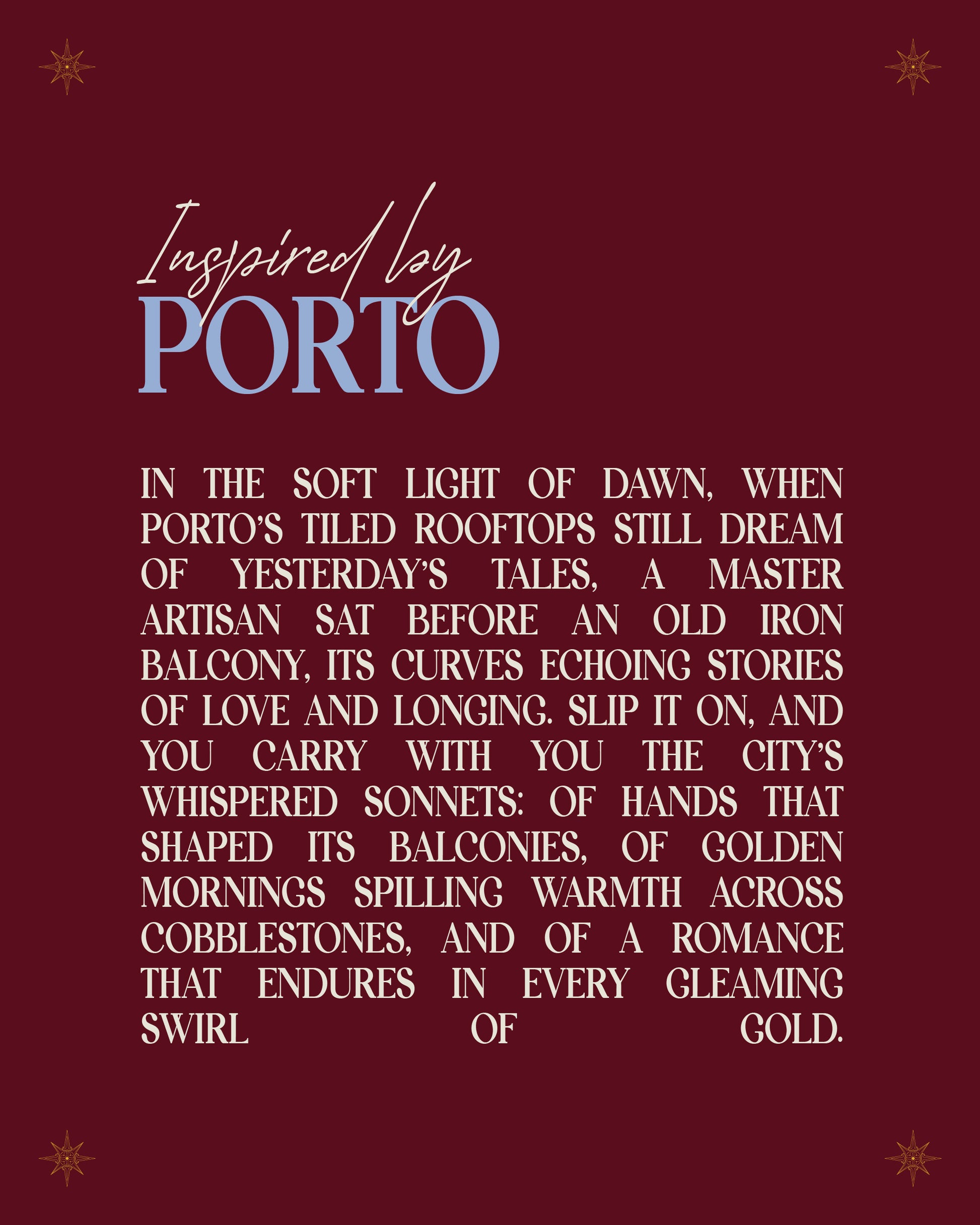 Each curve of its Art Nouveau filigree, lifted straight from an 1890s design, is etched with the same grace that once adorned Porto’s sunlit streets. Slip it on, and you carry with you the city’s whispered sonnets: of hands that shaped its balconies, of golden mornings spilling warmth across cobblestones, and of a romance that endures in every gleaming swirl of gold.