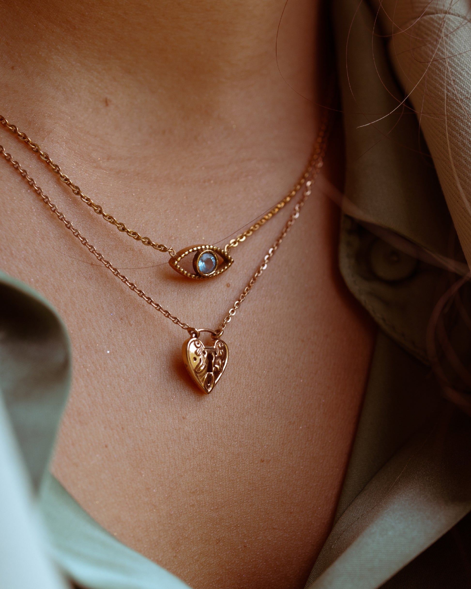 In the soft light of dawn, when Porto’s tiled rooftops still dream of yesterday’s tales, a master artisan sat before an old iron balcony, its curves echoing stories of love and longing. Drawing inspiration from those sinuous swirls, he crafted a slender 18k gold chain - so fine it seems to float - at whose center hangs a delicate heart-shaped lock.